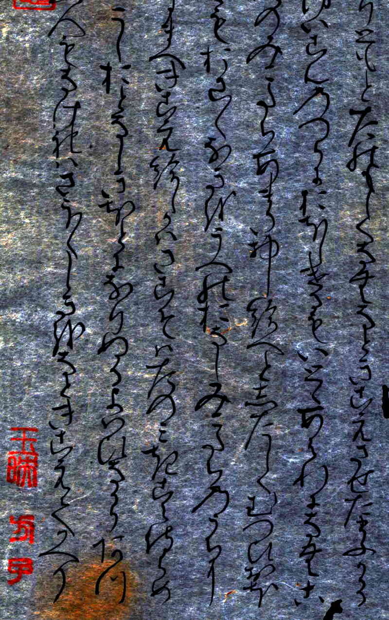 自筆の稀少価値は、和紙の生成技法の緻密さにあります。上の「拡大断層(MRI)写真」でわかる通り、極めて薄い和紙の上に墨の文字がくっきりと浮き上がるように「源氏物語」の文字が記されております。 出品している書の「断層(MRI)写真」の原板は、レントゲン写真と同じ新聞の半分ほどの大きさのフィルムです。肉眼では見ることのできない和紙の繊維の一本一本のミクロの世界を見ることができます。日本国内では医療用以外には見ることのできない書の「断層(MRI)写真」です。 古切の書は、一旦表装を剥離し分析と鑑定検査のために「断層(MRI)写真撮影」をしております。撮影後、展示のために再表装をしております。掛軸や屏風にすることが可能なように、「Removable Paste(再剥離用糊)」を使用しているため、自筆の書に影響をあたえずに、容易に「剥離」することができるような特殊な表装となっております。 |