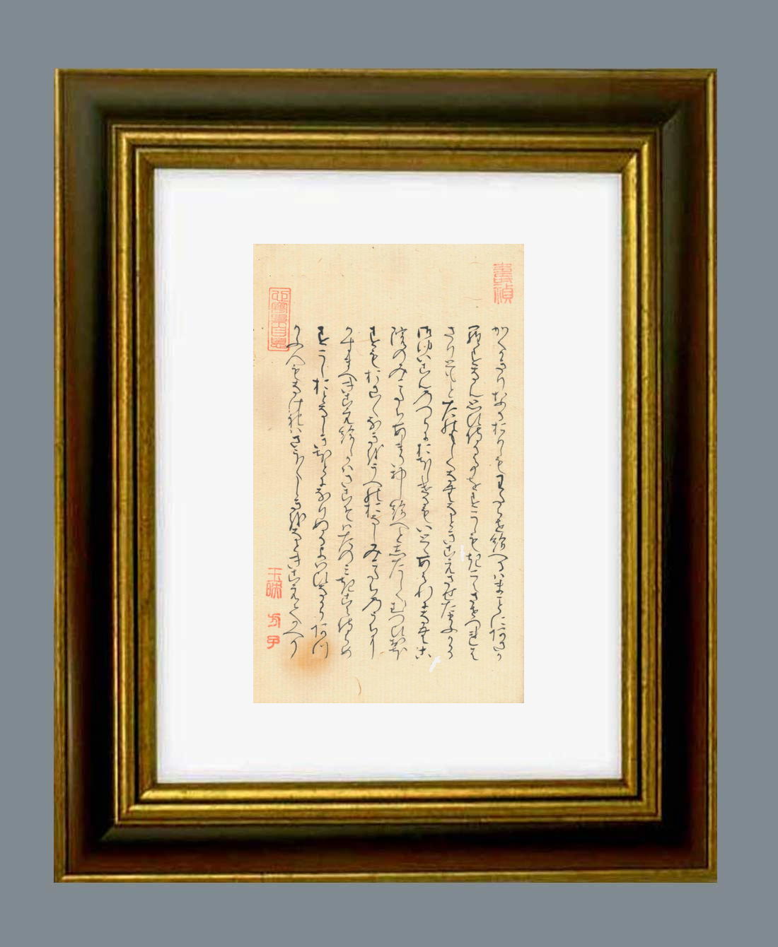 「源氏物語」自筆の大きさ タテ21.8センチ ヨコ12.8センチ。額縁の大きさは タテ37.0センチ ヨコ28.0センチです。額縁は新品です。 |