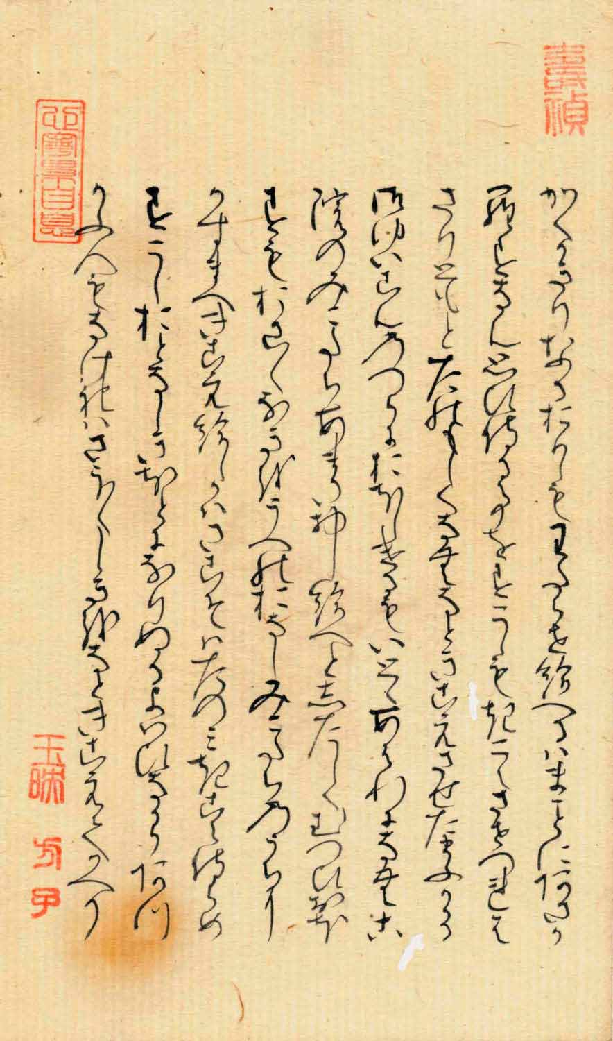 原文上部には「心寧累自息」《心寧(やす)ければ累(るい)も自(おのずか)ら息(や)む》という漢文の篆書印が押捺されている。言葉の意味は、「心安らかならば煩(わずら)いも自然に消える」である。