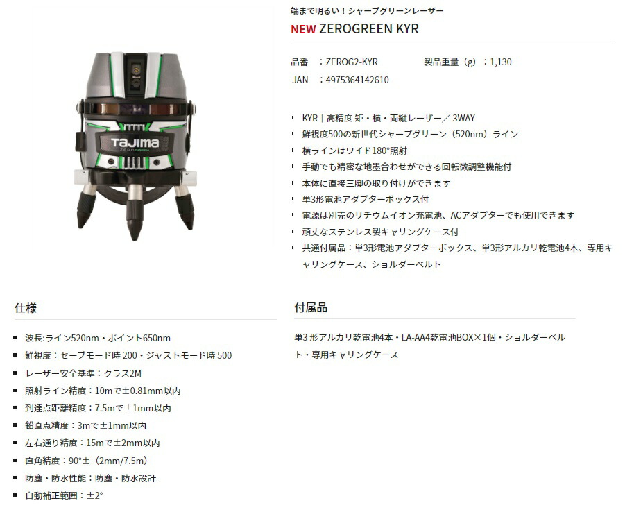 タジマ グリーンレーザー墨出し器 ZEROG2-KYR 高精度 矩・横・両縦レーザー ZEROGREEN KYR 077 TJMデザイン 142610 收藏
