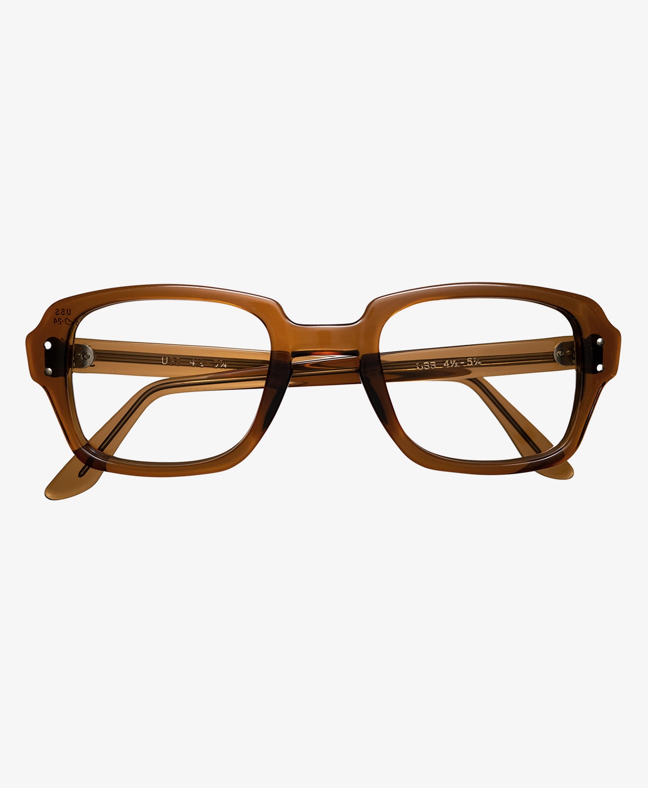 [美品60's~70's USAヴィンテージ眼鏡 50-24 肉厚フレーム USSアメリカ海軍ミリタリー ブラウン ウェリントン スクエア サングラスRomco1423] Supreme(シュプリーム)など有名ブランドがデザインソースとしていたことでも知られる、 USS(アメリカ海軍)ミリタリー、MADE IN USA、肉厚でファットなスクエアフレーム。 ミリタリーVINTAGEならではの"深み"がありつつも、様々なファッションに取り入れやすい 汎用性・デザイン性の高い完成された一本。 タフなセルロイド、シンプルな2DOTヒンジ、フロントは凹凸の少ないフラットな印象。 多くの方にフィットする[ 50mm(表記)レンズの大きめのGOODサイズ ]。 普段使いの眼鏡としてはもちろん、サングラスとしての使用もオススメ。 他にもヴィンテージUSSフレームを多数ご用意しております。 様々なサイズ、カラー、シェイプ、それぞれ特有の表情を持つフレームの中から、ベストな一本をお探しください。 <ヴィンテージメガネ全品はコチラ>からご覧ください。 ・コンディション