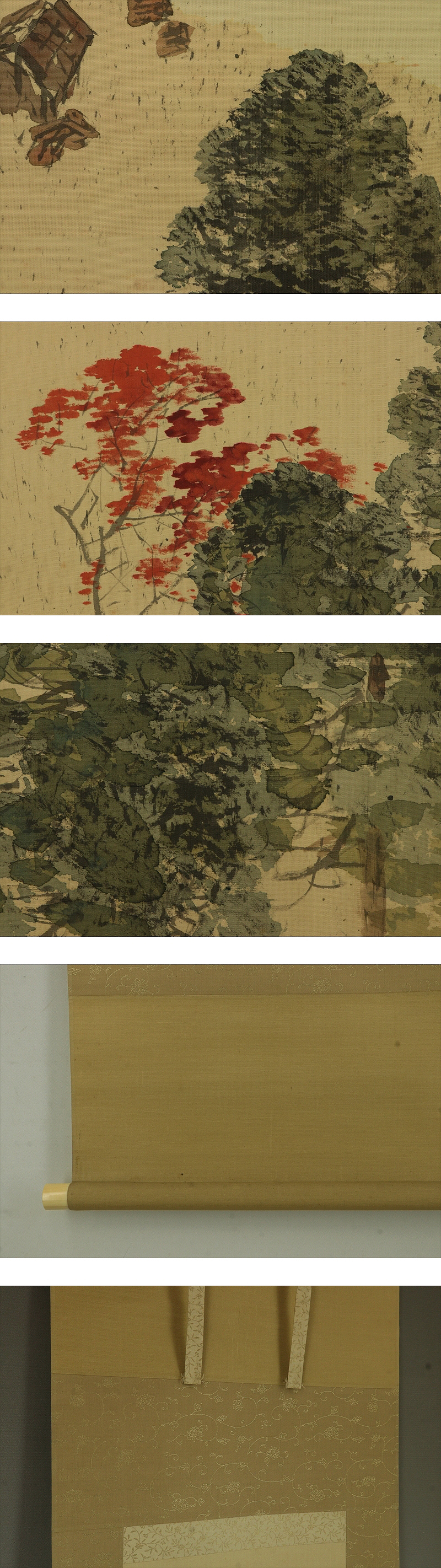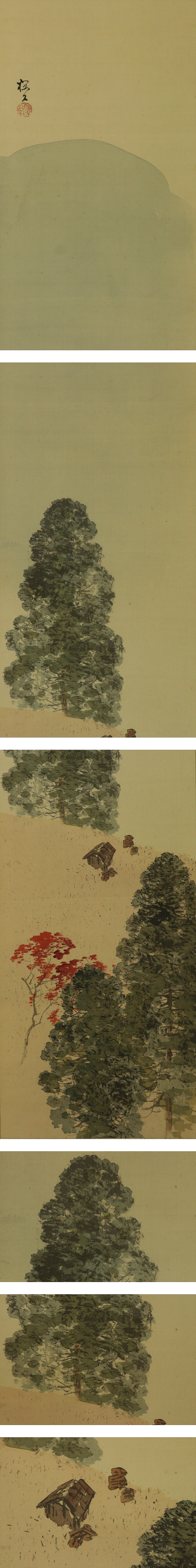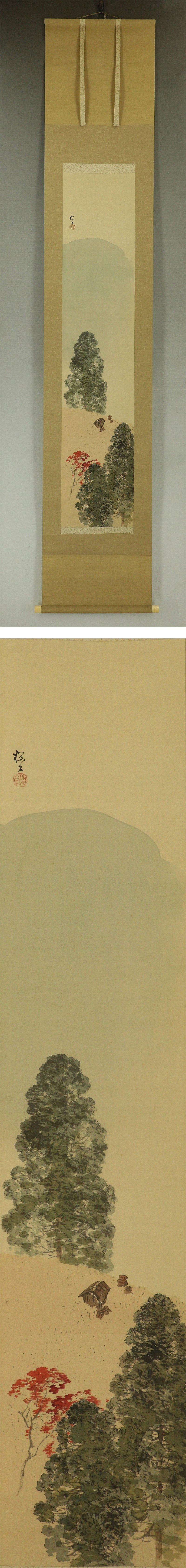 木島桜谷 このしま-おうこく(1877-1938) 円山・四条派の今尾景年に師事、また漢詩を山本谿愚に学んだ。 明治32年全国絵画共進会に「瓜生兄弟」を出品、宮内庁買い上げとなった。 その後京都美術協会展、新古美術品展などで毎回受賞した。 40年第1回文展に「しぐれ」が2等賞、以後大正元年の第6回文展で「寒月」 が2等賞になるなど毎回賞を得た。同年京都市立美術工芸学校教諭、 2年の第7回文展では審査員、3年無鑑査。4年京都市立絵画専門学校教授となった。 昭和8年第14回帝展に「峡中の秋」を出品、その後は画壇を離れ、漢籍に親しむ日々を送った。 本紙は、染み、軽い折れがあります。 表装は、染み、汚れ、皺、虫食、ほつれ、くすみ、軸先に傷みがあります。 【サイズ】 作品 横約26.5cm×縦約129cm 表装 横約40cm×縦約215cm |