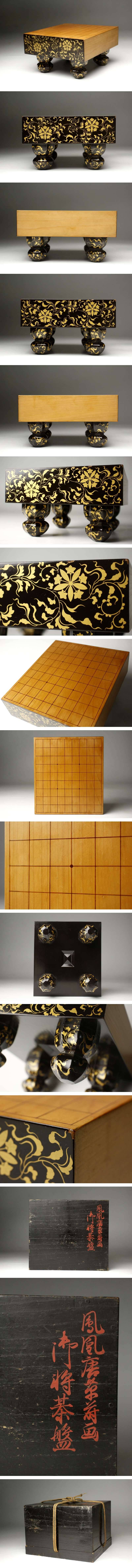 高級感溢れる蒔絵で仕上げられた雛道具、将棋盤のご紹介です。 木材と蒔絵の施された面との対比が鮮やかで、どちらの質感も楽しめる仕上がりをしています。 唐草蒔絵の中に竜胆車紋が入っており、さりげなくも家門を誇示する演出は流石の貫禄を感じさせます。 大名道具ならではの豪華さの中に奥ゆかしさもある上質な逸品です。