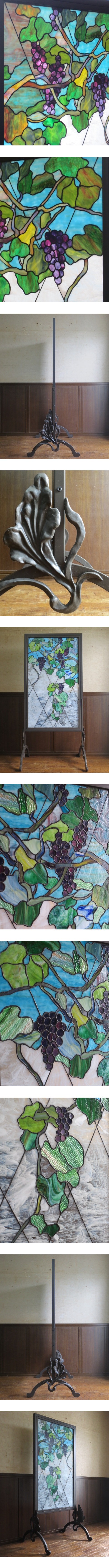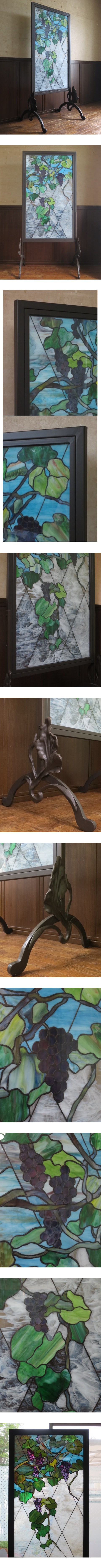逸品 ステンドグラス 葡萄文様 鋳物フレーム 衝立/パーテーション/間仕切り/大正/昭和レトロ/氷コップ/色ガラス/ガラス工芸/アンティーク 收藏