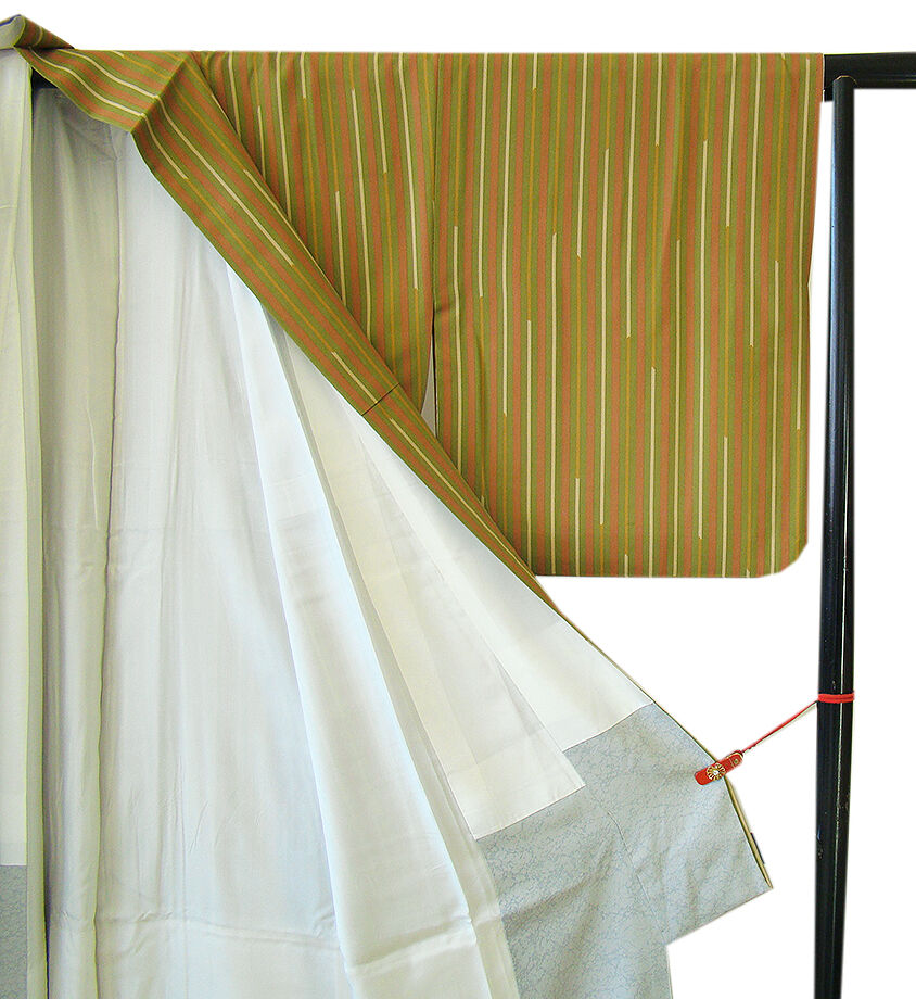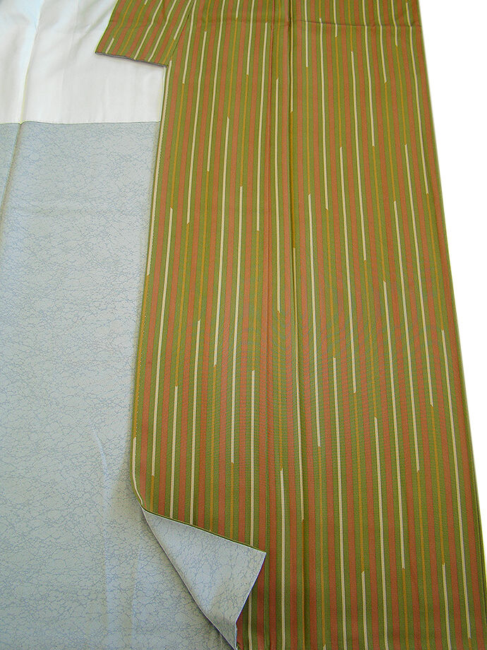 商品説明 | こちらのお品は「袷」でございますので、10月~5月までお召頂ければと思います。 とてもしなやかなさらりとした着心地良い重めの極上一越地の生地、 根岸色地に黄土、赤茶、ベージュ色の染柄、 八掛は薄雲鼠色に灰青色の染柄(正絹)、幅広い年代の方にお召頂けます。 |