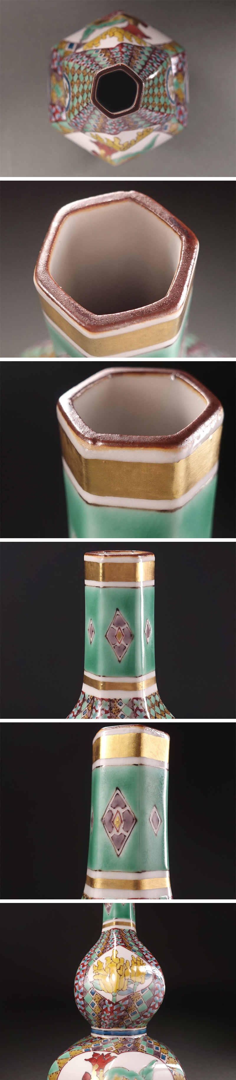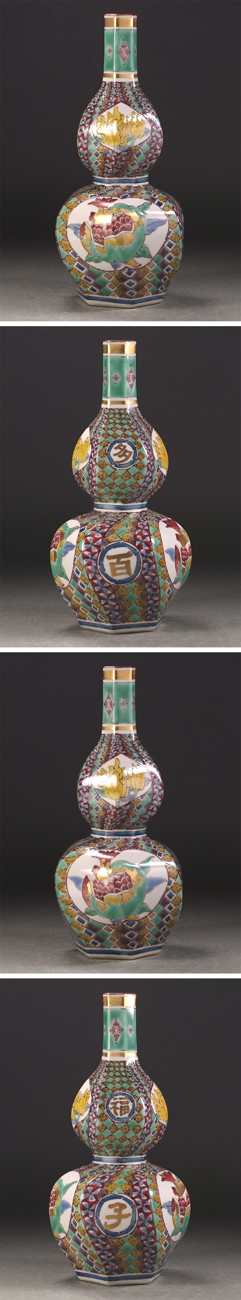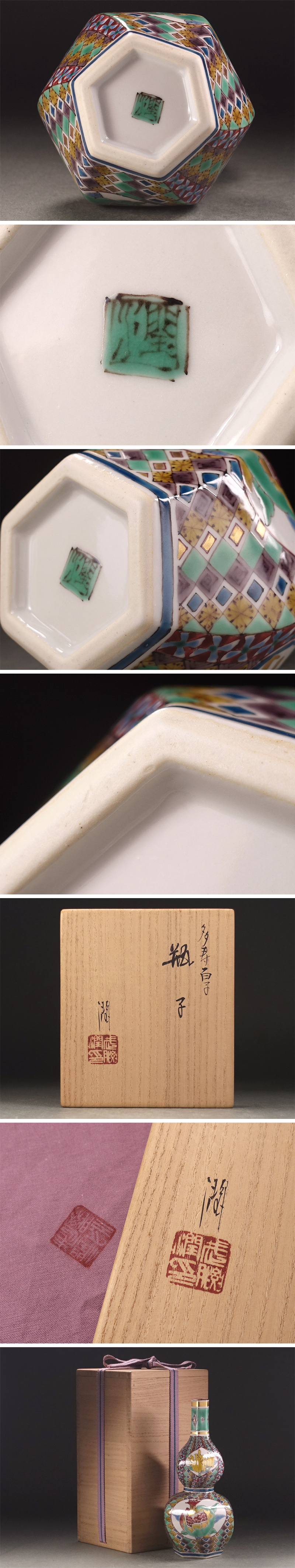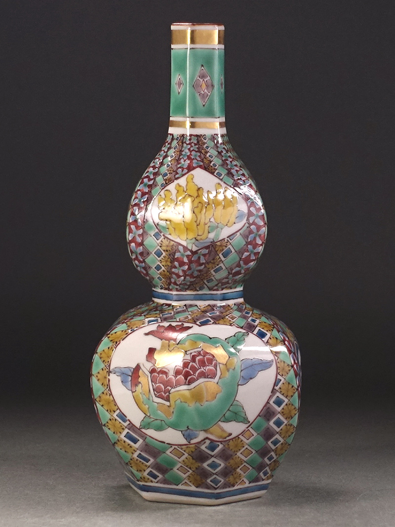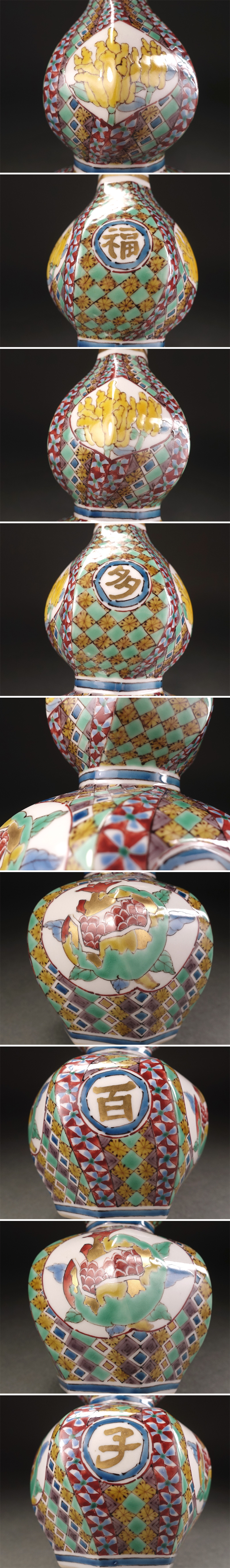 ∇花∇現代九谷の名工【武腰潤】作 多寿百子文字入 色絵金彩柘榴に仏手柑文瓶子 瓢形捻徳利 華麗な細密地紋 共箱付 收藏