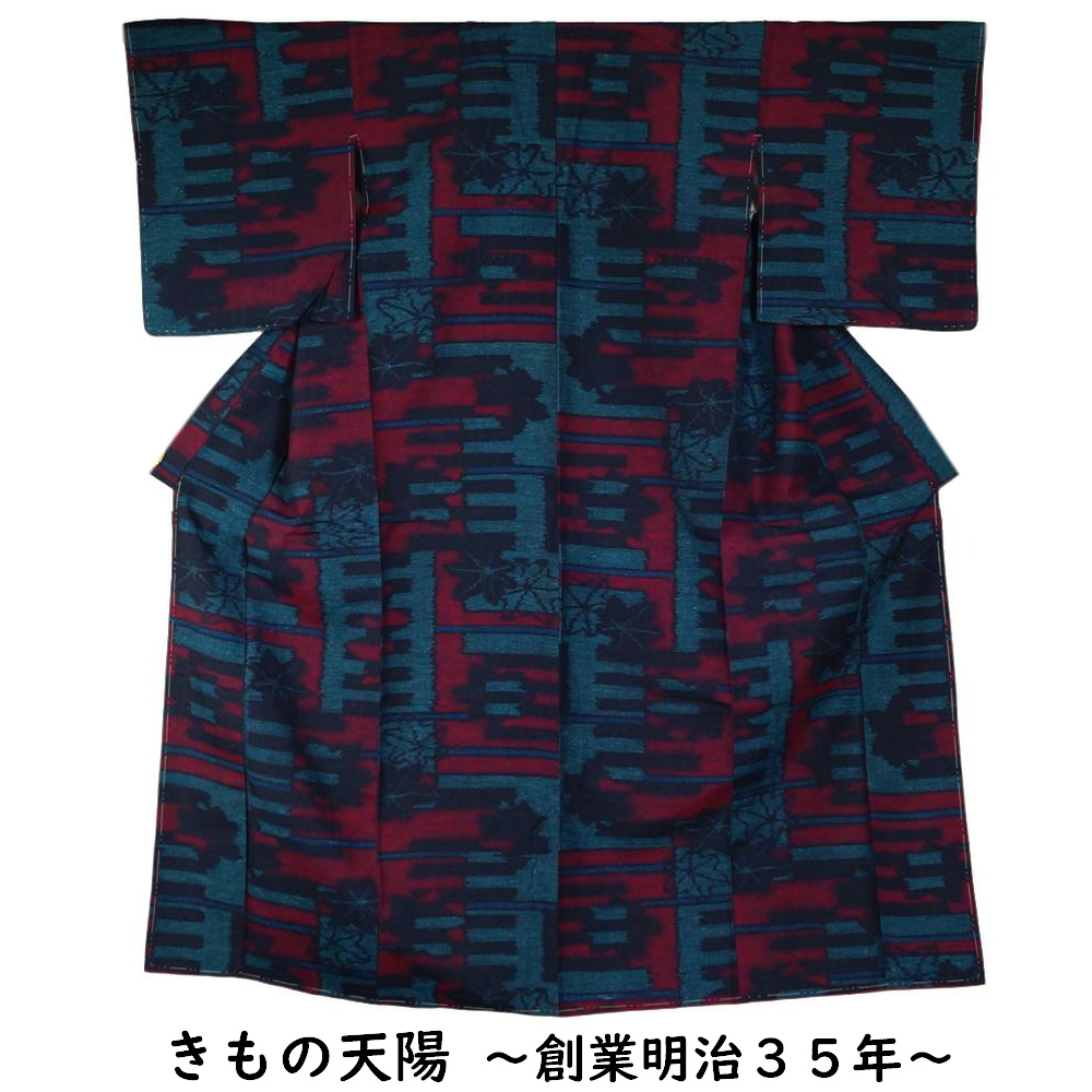 紬 未使用品 楓に幾何学模様 Mサイズ 濃紺色系 中古 リサイクル着物 正絹 京都きもの天陽 收藏