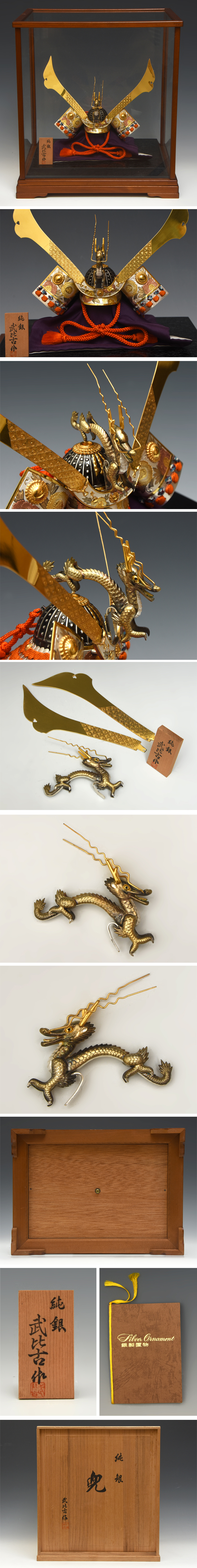関 武比古 (作) 純銀 兜 置物 オブジェ ガラスケース PURE SILVER 麒麟 金属工芸 |