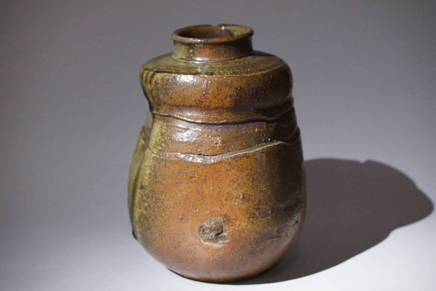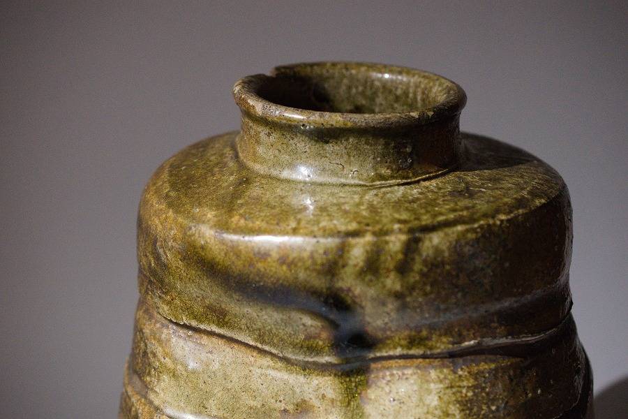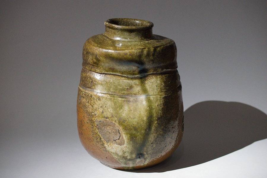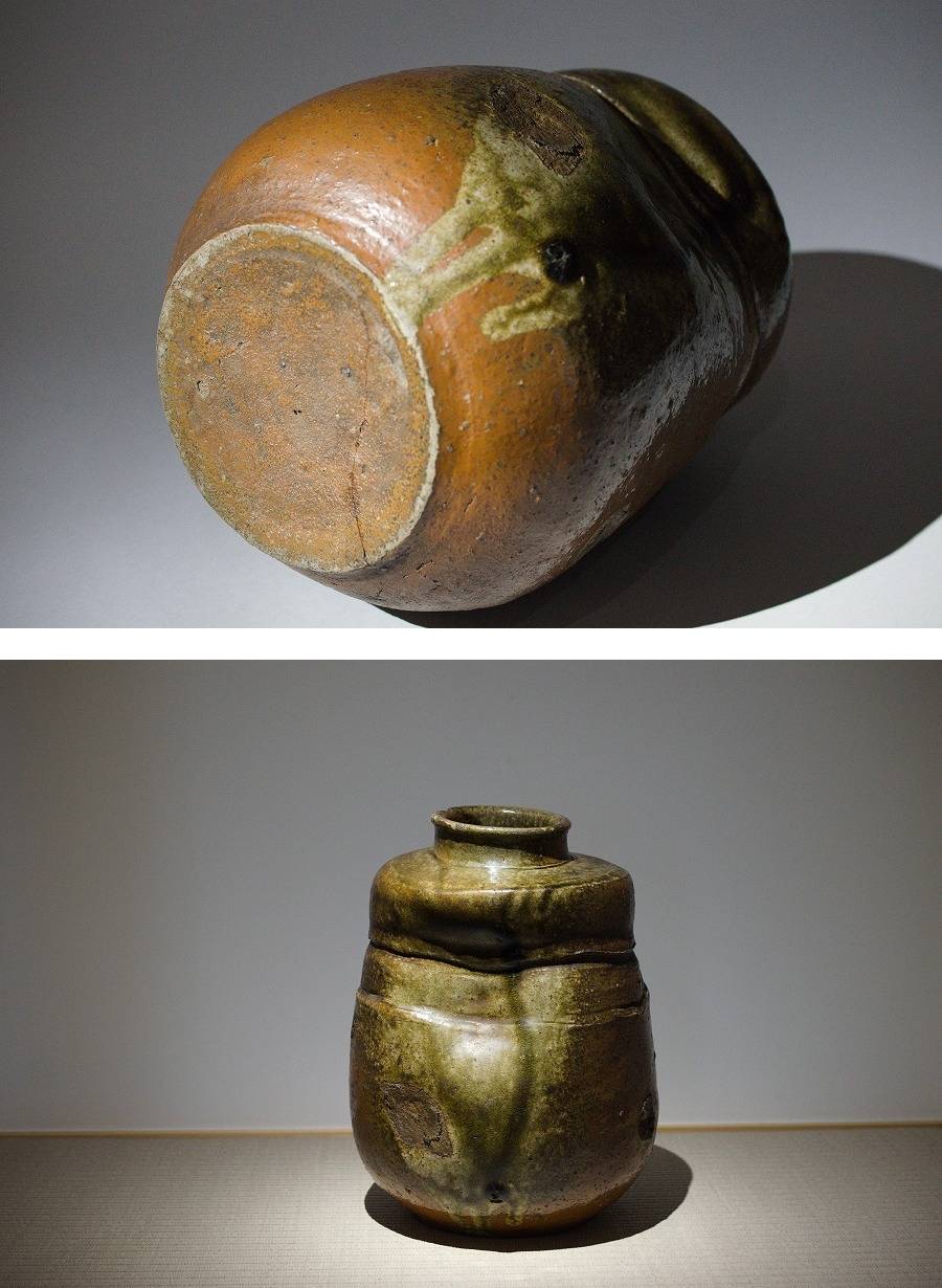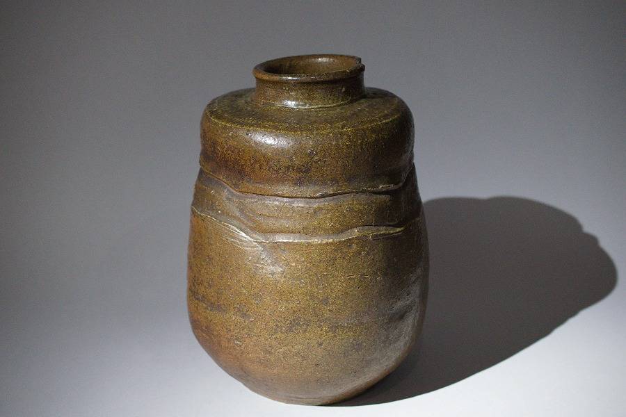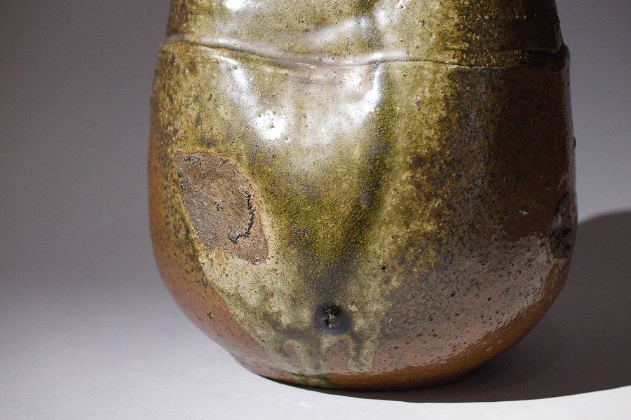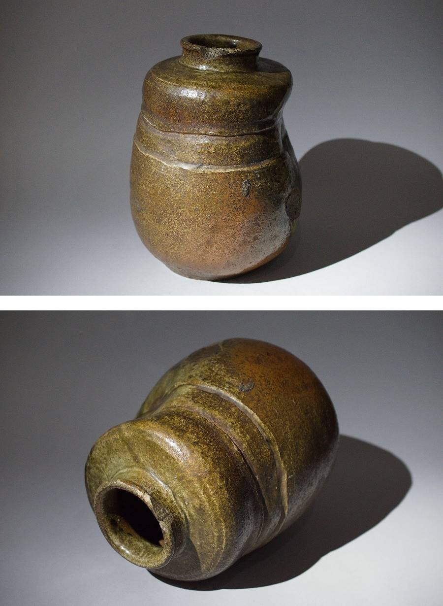 古丹波の肩衝壺です。底から肩にかけての深いニュウがありますが(画像参照)瀑布を彷彿とさせるようなすばらしい釉の景色と、いかにも桃山期らしい、自由奔放、かつ力強い造形を堪能できるような作品です。枝ものを入れると、どれほどかっこいい壺でありましょう。なお参考として兵庫陶芸美術館が刊行した図録を掲出しました。同時代の作品ですが、釉景色の美事さにおいて当出品はより秀でているものと考えておりますがいかがでしょう。