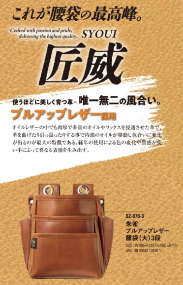 ふくろ倶楽部朱雀「匠威-SYOUI」 プルアップレザー 腰袋 大 3段SZ-876-3これが腰袋の最高峰。使いほどに美しく育つ革-唯一無二の風合い。プルアップレザー採用。オイルレザーの中でも肉厚で多量のオイルやワックスを浸透させた革で、皮を曲げたり引っ張ったりする事で内部のオイルが移動し色合いに変化が出るのが最大の特徴である。経年の使用による色の変化や質感が使い手によって異なる表情を生み出す。■仕様サイズ:H225(195)x W180 x D110 mm※天然素材の使用と手作りのため、色柄や形・サイズに多少の差がある場合がありますので、予めご了承願います。※また製品改良のため、素材・形状など一部仕様が変更になる場合がございますが、機能・品質等に差異のないものを提供致しますので、予めご了承ください。
