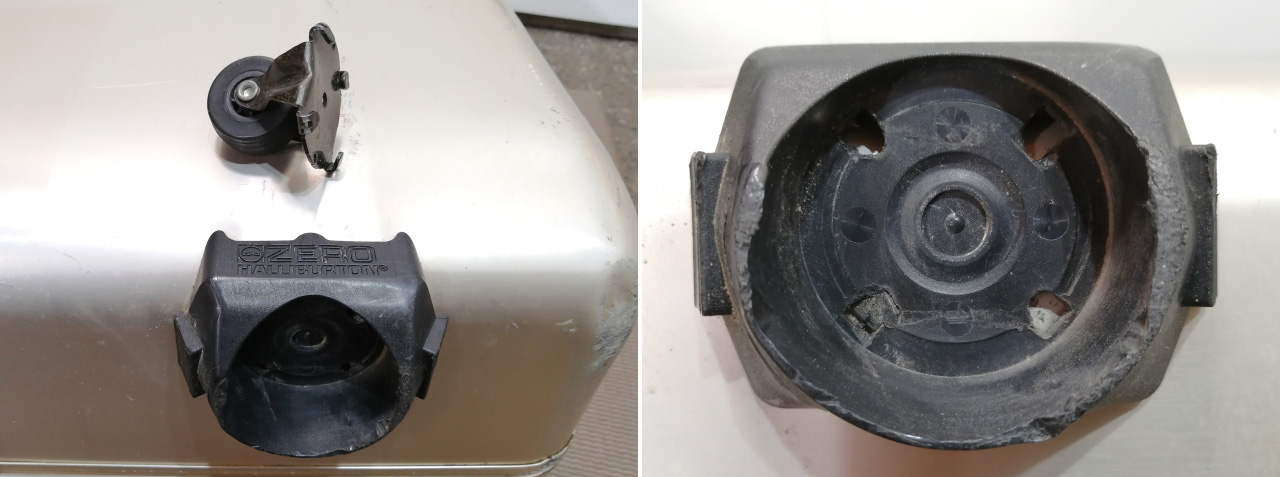 キャスターが一か所取れており、他のキャスターもかなりの擦り減りがあるため、現状品となります。