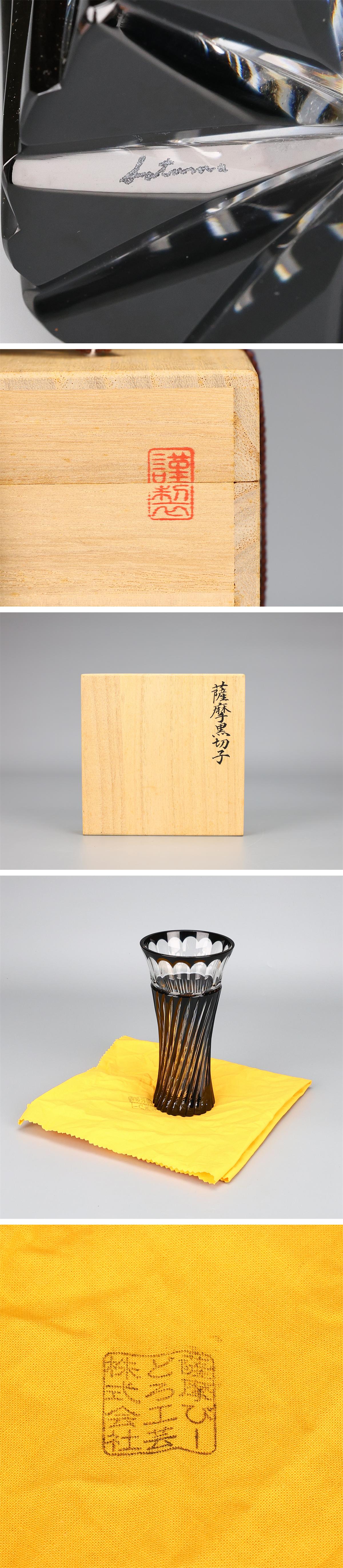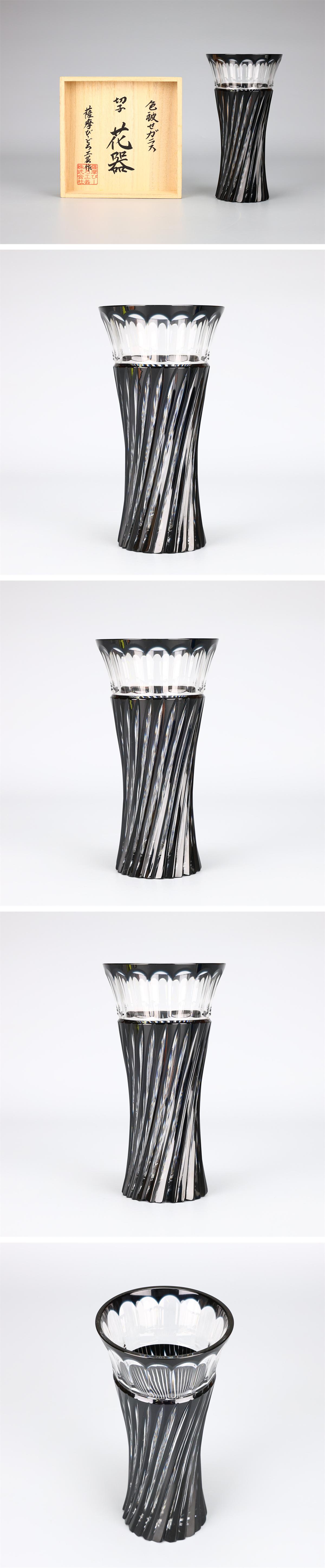【吉】PC966 【薩摩びーどろ工芸作】 色被せガラス 最高級 薩摩黒切子 花瓶/共箱付 本物保証 美品Sg! 收藏
