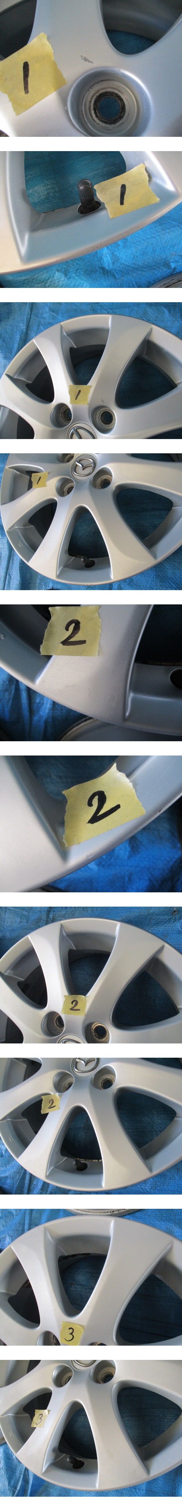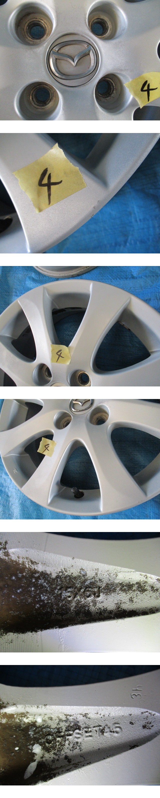 ※下記情報をよくご確認いただいたうえで入札してください。 弊社では「まとめて取引」への対応は行なっておりません。 同梱をご希望の場合はご入札前にご質問下さい。 同梱可能な商品の場合は対応いたします。 また、質問や連絡等なくまとめて購入を選択・決済をされた場合は別途追加の送料をいただくことがあります。 営業日15時までの入金確認で即日発送できます。 日曜日、第2・第4土曜日、祝祭日はお休みを頂いてます。 ■取り外し車両 ●認定型式=DBA-DE3FS(マツダ デミオ) ●年式=2009/01 ●車体番号=182*** ●走行距離=99,701km ●エンジン型式=ZJ-VE(1.3L車) ●ミッション=4AT ●型式指定/類別区分=15700/0053 ●グレード=13S ●駆動=2WD ■詳細 ・上記車両からの取り外しです。 ・ホイール4本セットの出品です。 ●ホイール DE3FSデミオ(13S) 純正アルミ シルバー サイズ 15×6J +45 ハブ径54mm 4H PCD100 ■状態 ●ホイール 4本ともに経年劣化による色あせや色剥がれあります。また、③・④が①・②に比べて劣化が進んでいます。 その他4本とも使用上の小キズあります。 曲がりや変形はありません。 ・気持ち良くお使い頂く為、出来る限りの掃除はしています。 ※当方で自動車部品を出品していますので、よろしければ下記のURLよりご覧ください。 team818ys出品リスト⇒https://auctions.yahoo.co.jp/seller/team818ys ■在庫管理番号 2500521-1 ■送料 (元払いのみの対応)運送会社の選択はできません。 [ 北海道 ] 5400円 (北海道) [ 東北 ] 3600円 (青森、岩手、秋田 山形、宮城、福島) [ 関東・中部 ] 3500円 (茨城、栃木、群馬、埼玉、千葉、東京、神奈川、山梨、新潟、長野、静岡、愛知、岐阜、三重、富山、石川、福井) [ 関西 ] 3000円 (滋賀、京都、大阪、兵庫、奈良、和歌山) [ 中国 四国 ] 3000円 (鳥取、岡山、島根、広島、山口 香川、徳島、愛媛、高知) [ 九州 ] 3600円 (福岡、佐賀、長崎、熊本、大分、熊本、宮崎、鹿児島) 沖縄県・離島の方は送料をお問合せ下さい。 最後までご覧頂き有難うございました。ご検討宜しくお願い致します。 | ||||