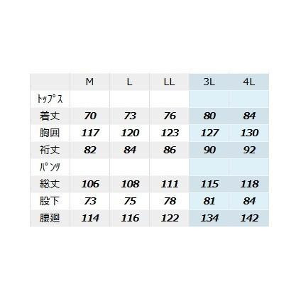 | サイズ | M トップス(着丈:70/胸囲:117/裄丈:82)パンツ(総丈:106/股下:73/腰廻:114)cm 個装サイズ:30×22.5×6cm |