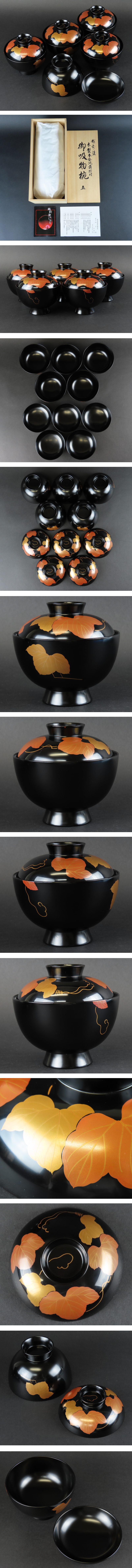 【月】【骨董品 茶道具48】美品 越前塗作家 山下近 吸物椀5客 木製本堅地蒔絵 朝顔葉文様 / 輪島塗 漆器 收藏
