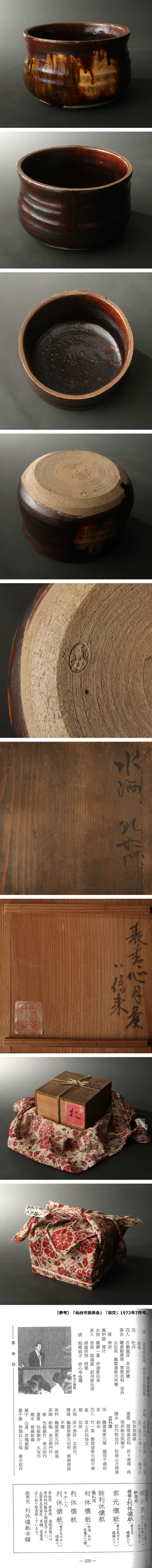 三浦乾也の建水です。 捻貫と鉄釉の重ね掛けによる頽れた景色が出色です。松浦心月庵の箱甲書、および蔵判が貼付されております。 『淡交』1972年7月号の「仙台市民茶会」濃茶席道具組にみえる「建水 初代乾也 松浦心月侯箱」に同定され、席主・鈴木宗保の元に当時伝来し、箱蓋裏の「表書心月侯 同伝来」の文字は宗保の筆とみられます。 この仙台市民茶会は前年に落成した「仙庵」に鵬雲斎家元(当時)と嘉代子母堂・登三子夫人を迎え開催された第一回であり、仙台藩ゆかりの取り合わせが随所に見受けられます。乾也は長崎遊学中に造船技術を学んだことで、仙台藩の招聘の元開成丸を建造しており、幕末期まで仙台藩士であったことが知られます。宗保師は嘉代子母堂と同じく旧仙台藩士出身でした。 仙庵が仙台市民に初お披露目された茶会を、華々しく飾った逸品です。 ◆三浦乾也 幕末-明治期の陶工。伯父井田吉六に陶法をまなぶ。西村藐庵から乾山伝書をゆずられ,乾山6代を称す。破笠細工で有名。幕命により長崎で造船術をまなび,安政4(1857)年仙台藩で洋式軍艦開成丸を建造。ほかに碍子,煉瓦の製造など開明期に多彩な活躍をした。1889年没。69歳。江戸出身。号は天禄堂。 ◆松浦心月庵 幕末-明治期の大名・華族。松浦秋の長男。伯父曜の養子となり、安政5(1858)年肥前平戸藩(長崎県)藩主松浦家12代。海防を整備し、倹約と殖産興業を推進した。伯爵・貴族院議員。茶道石州流鎮信派家元。歌会始奉行もつとめた。明治41(1909)年死去、69歳。字は景武。通称は源三郎。 ◆鈴木宗保 近代の茶人。号は日々庵。仙台の人。裏千家茶道を学び、淡々斎に重んじられた。秋山宗古・山村宗満とともに「裏千家三羽烏」の一人に数えられ、家元に次ぐ中堅株の茶人として他流派からも一目置かれた。『裏千家茶の湯』など著書多数。昭和55(1980)年没、98歳。 ◆仙庵 仙台市太白区の大年寺山公園の茶室。昭和47(1972)年に清香院(鵬雲斎御母堂・千嘉代子)の仙台市名誉市民推戴を記念して仙台市に寄贈された。鵬雲斎の指導と工匠の優れた技術により精巧を極め、銘木・北山台杉を用いた数寄屋造りの茶室、そして京都の名石が随所に用いられた庭園は「東北の名席」と称される。 付属:松浦心月庵(箱甲)・鈴木宗保(箱蓋裏)書付箱が付属します。 寸法:高さ9cm、幅15cm(最大幅。若干の誤差はご了承下さい) 状態:経年感がございます。 |