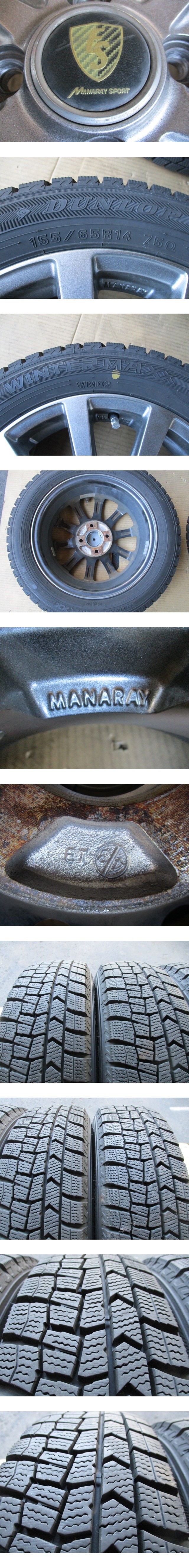 MANARAY SPORT アルミホイール4本です。※タイヤサイズ※155/65R14 DUNLOP WINTER MAXX WM02(21年製 )残溝は7分山~ぐらいです。※ホイールサイズ※14×4.5J PCD100 +43 ハブ径65㎜ ※大きな目立つ傷は有りませんが多少の飛び石、擦り傷、線傷あります。 中古品の為ノークレームノーリターンでお願いします。送料は岐阜発元払い4本5,260円(中部、関東、関西)~6,880円(北海道)8,060円(沖縄)の間になります。※直接の引き渡しは不可です。発送のみの対応にてお願い致します。