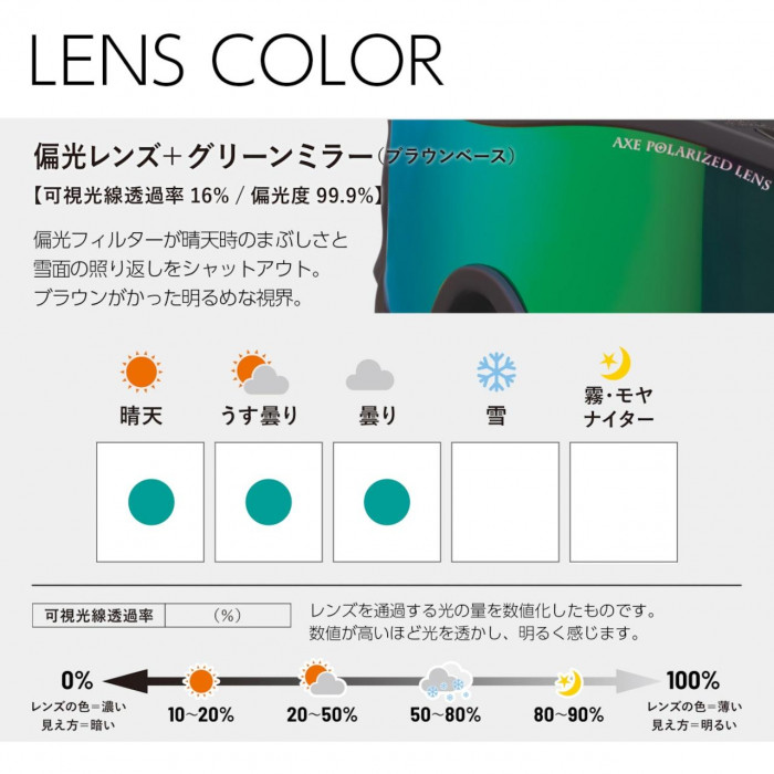 | 仕様 | フレーム:マットブラック レンズ:偏光+ブラウンベース ミラー:グリーンミラー 可視光線透過率:16% UVプロテクション ツインアジャストベルト センターバックル 撥水性ベルト |