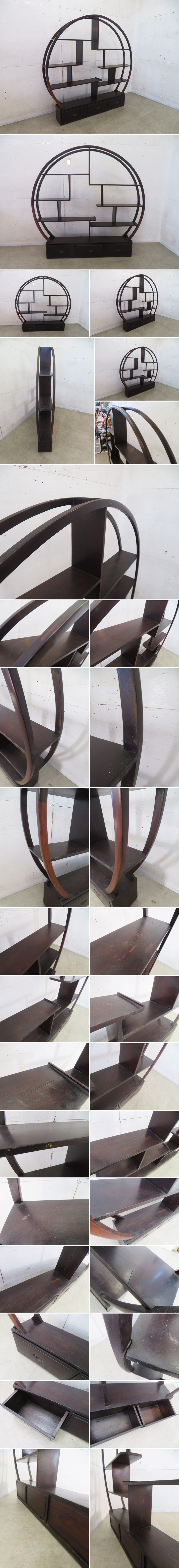 硬質で美しい木目が特徴の唐木無垢材を使用した、円形の飾り棚です。 中国の伝統的な様式である博古架(はっこうか)と呼ばれるこの棚は、 複雑に仕切られた棚板がアシンメトリーな美しさを演出し、茶器や骨董品、盆栽などを飾るのに最適です。 下部には便利な引き出しが3杯付いており、収納力も兼ね備えています。 時を経るほどに深まる風合いと、釘を使わない伝統的な組構造による職人技が光る逸品です。 和室の床の間はもちろん、モダンなリビングのアクセントとしても存在感を放ちます。 上質な和風・アジアン家具をお探しの方、唯一無二のインテリアをお探しの方に心からお勧めできる逸品です。 この機会に是非ご購入ご検討ください。 コンディション:中古のため写真のように使用感、傷、汚れ、一部にひびはありますがその他はとくに大きなダメージもなく、使用に問題ありません。 サイズ 横162センチ奥23センチ高161センチです。