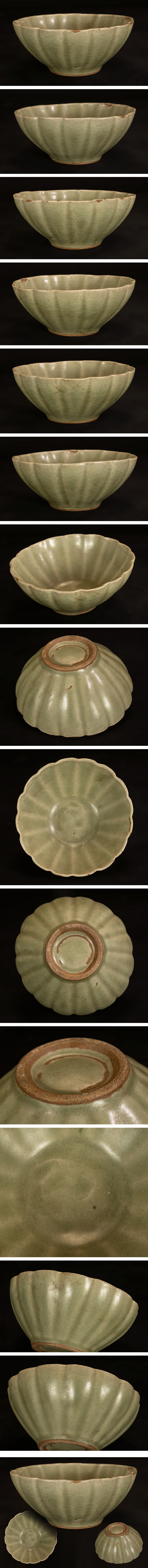 ●中国古美術 青磁 花口(瓜稜)碗 鉢 茶碗 貫入釉景 口径約13cm 口縁釉禿● 收藏