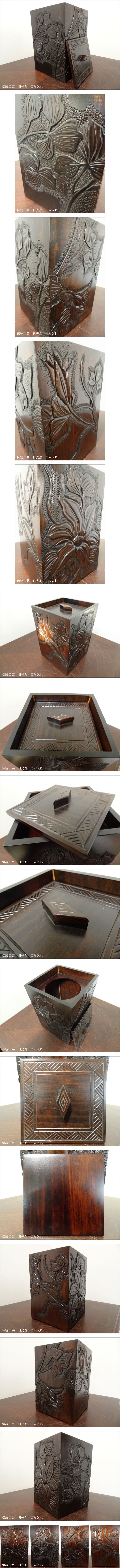 伝統工芸 日光彫り 在銘 草花図四面彫 蓋付 ごみ入れ くず箱 ごみ箱/民芸家具茶道具和家具 | |||||||||||||||