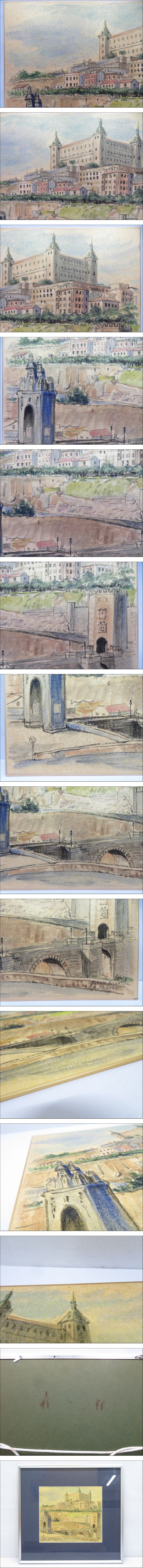 【真作】 関口昌孝 「スペイン風景(トレド) アルカンタラ橋からアルカザール宮殿を望む」 色紙画 風景画 落款印 額寸/約41cm×約44cm 收藏