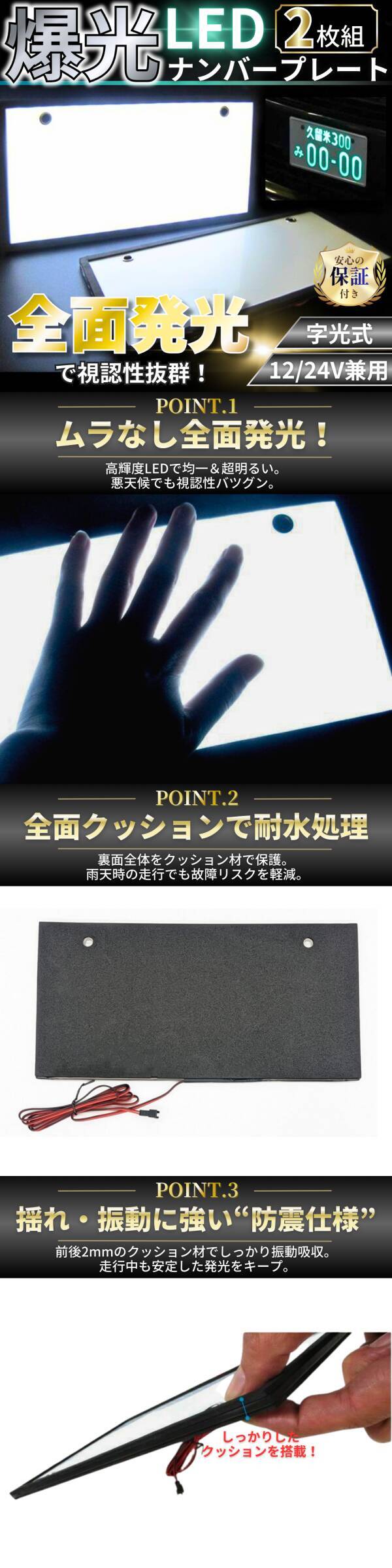 ・普通車のリアは封印前のみ取付可能です ・軽自動車はそのまま取付できます ・本商品は字光式ナンバー専用です(通常ナンバーは発光しません) ・輸入品のため小傷・汚れがある場合があります ・加工後の不良は保証対象外となります ・大型車で電圧30Vを超える車両には使用不可 ・必ず取付前に仮付けして点灯確認をお願いします |