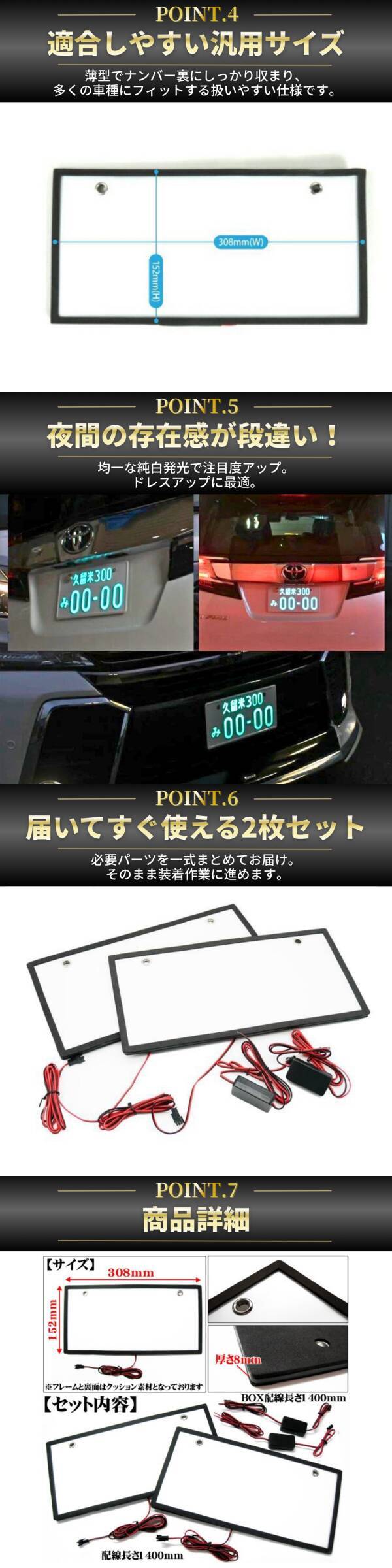【製品詳細】 ・12V/24V対応(普通車/軽自動車など全車種) ・全面発光タイプ高輝度LED ・均一でムラのない発光 ・薄型設計(約8mm) ・裏面クッション素材で車体を保護 ・ホワイト発光 ・サイズ:152×308×8mm(目安) ・ホール間:214mm ・配線:約1400mm(本体/イグナイター) ※測り方により多少の誤差があります ※取付後は配線部の防水対策を推奨します 【セット内容】 ・LED字光式ナンバープレート × 2枚 ・配線セット×2 |