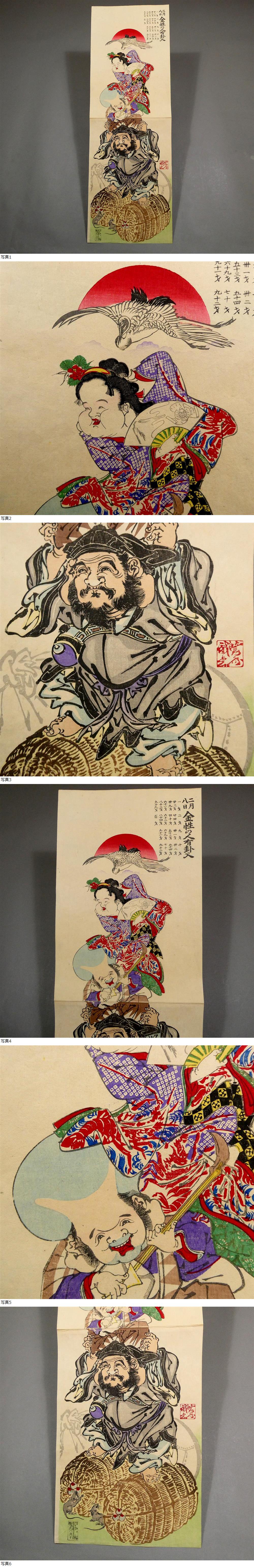 河鍋暁斎◆縦2枚続揃い 有卦絵◆招福 三段重ね!◆「二月八日 金性の人有卦ニ入」明治時代 木版浮世絵■厄除 縁起物 錦絵 大黒天 骨董 19 收藏