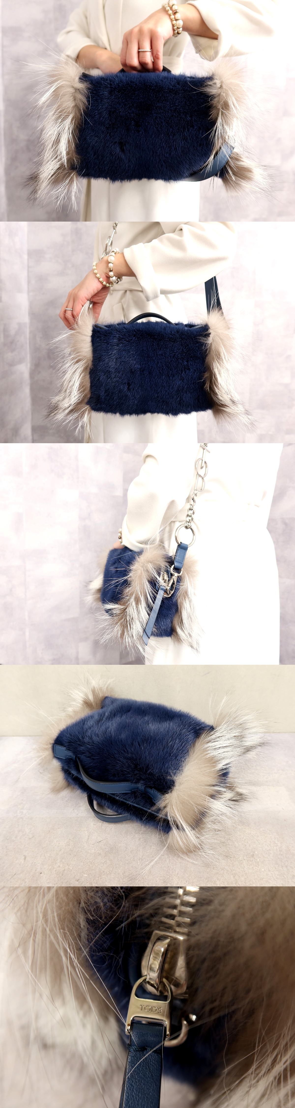 ●超美品●TODS トッズ●ゴンミーニ●リアルファー●2way ハンド バッグ●ネイビー グレー●シルバー金具●肩掛け●収納 かばん●Js64427 收藏