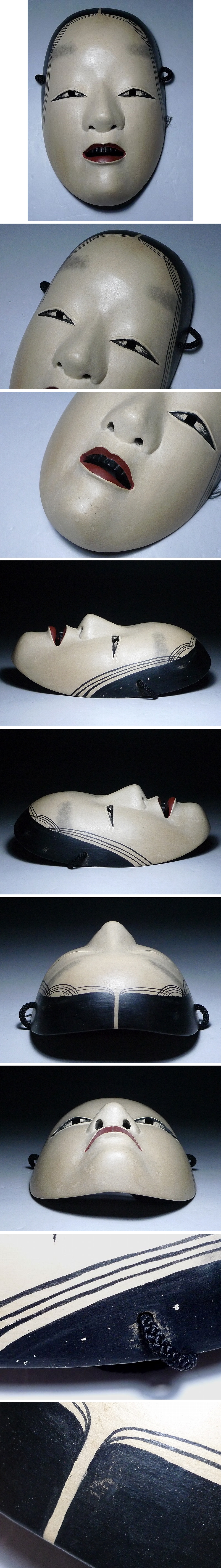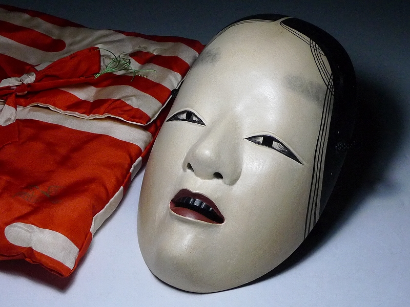 60KK162★能面 若女 女面 お歯黒 木彫り 神楽 能楽 狂言面 保存袋付 彫刻 色彩 伝統芸能 日本美術 伝統工芸 收藏