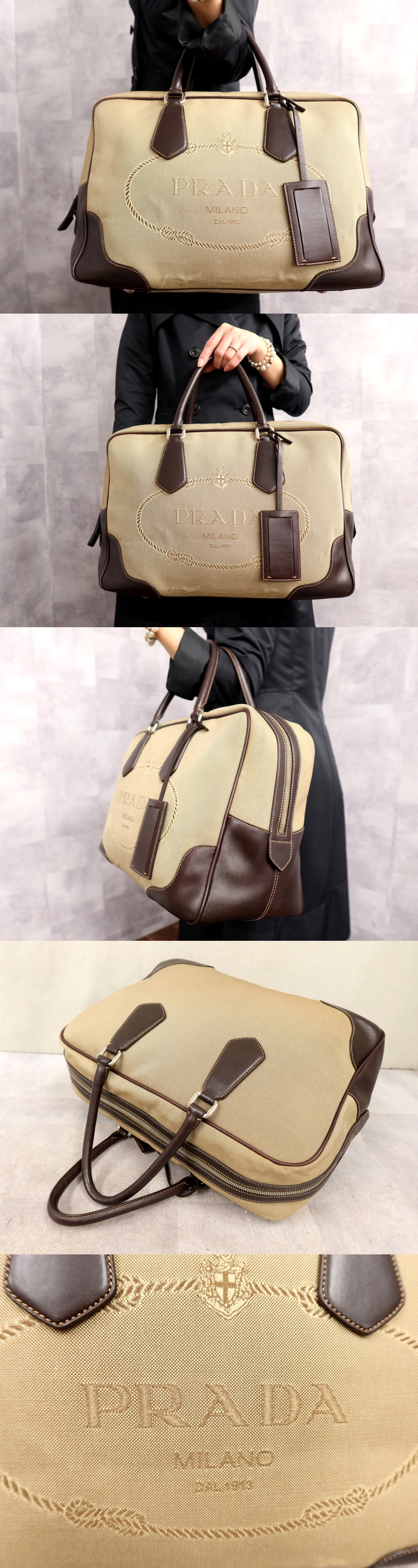 ●超美品●PRADA プラダ●キャンバス カーフ レザー 本革●ハンド バッグ●ベージュ ブラウン●シルバー金具●腕掛け●A4 かばん●Js65037 收藏