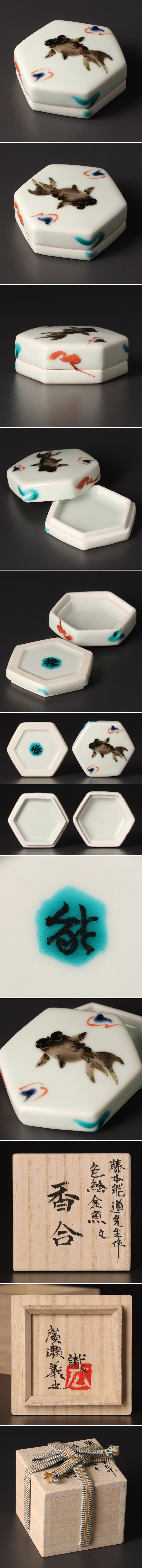 | 【古美味】人間国宝 藤本能道作 色絵金魚文香合 廣瀬義之識 茶道具 保証品 |