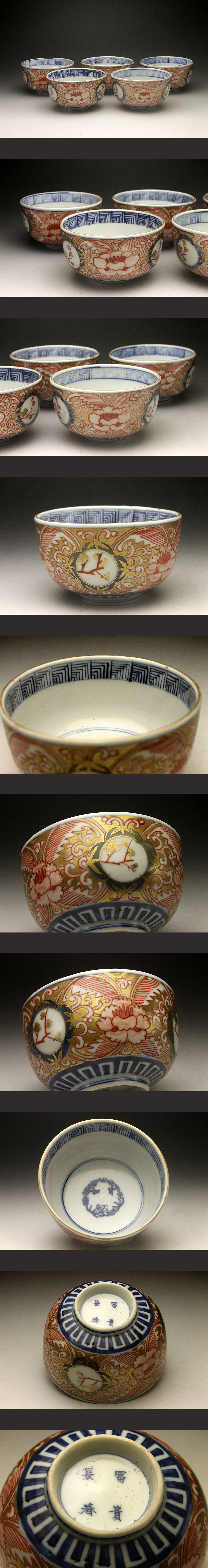 【余韻】 古伊万里 富貴長春 赤絵金襴手 牡丹文 小鉢 湯呑揃(5客)★懐石道具 茶道具 無傷美品<同梱可> 收藏