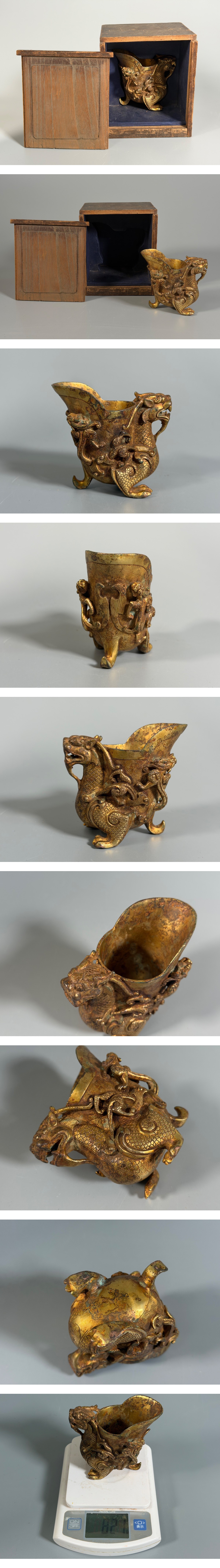 【小】5570 コレクター収集買出品 中国古美術 古銅鍍金古獣杯 時代誂え伝世箱有 爵 金杯 塗金 青銅器 細密細工 中国古玩 唐物 收藏