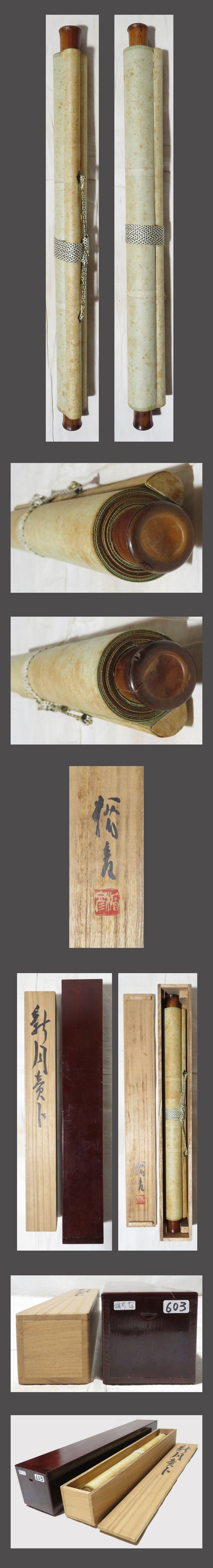 肉筆、真作保証。 作品に、時代感、シミ、汚れ、折れ、巻きじわがあります。 表装に、時代感、多数のシミ、汚れ、折れ、巻きじわがあります。 表装裏側に、経年による多数の濃いシミ、汚れがあります。 箱は二重箱の共箱です。軸先があります。 菅楯彦 略歴:美術評価額500万、芸術院恩賜賞、日展会員、 土佐派、風俗画、鳥取、没年昭和38年、享年85歳。 下記の真作保証について・注意事項をよくご覧の上、 お気に召された方に、お譲り致しますので、ご入札を宜しくお願い致します。 |