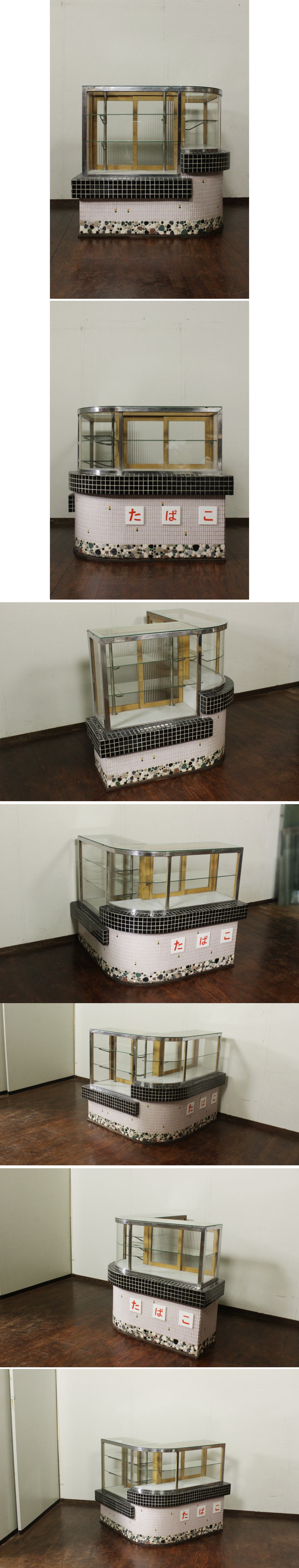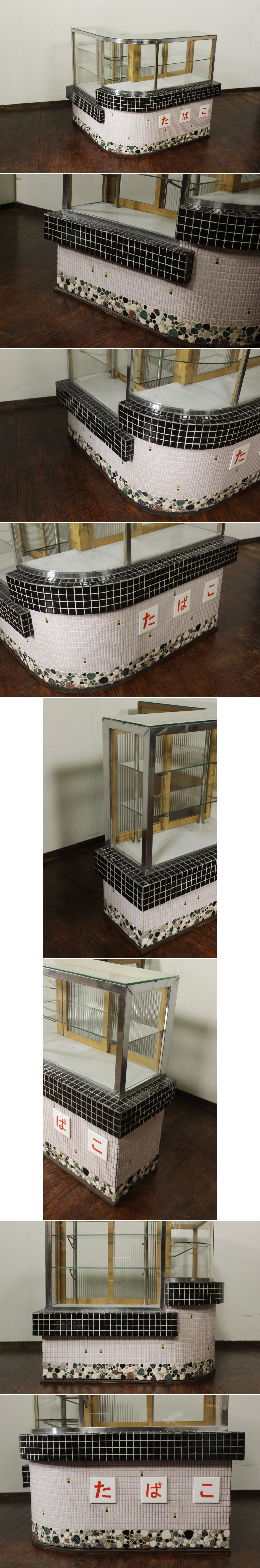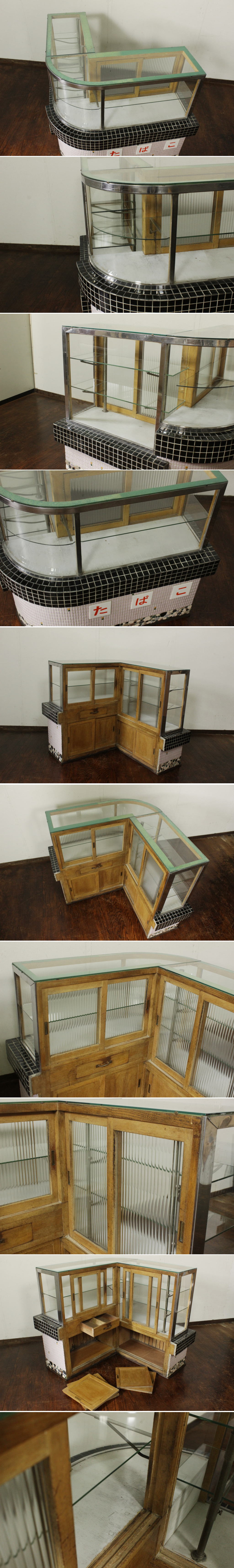 昭和レトロ 曲面ガラス Rガラス L型 タイル付き ガラスショーケース レジカウンター 古道具 店舗什器 ヴィンテージ 收藏
