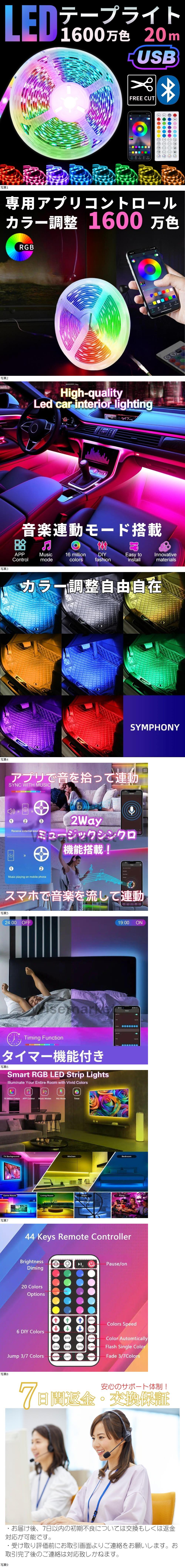 | LED オーロラ テープライト 20m RGB調光 USB式 音楽連動 間接照 明 ストリップライト 車内 フロア ドア フットランプ リモコンアプリ対応 |