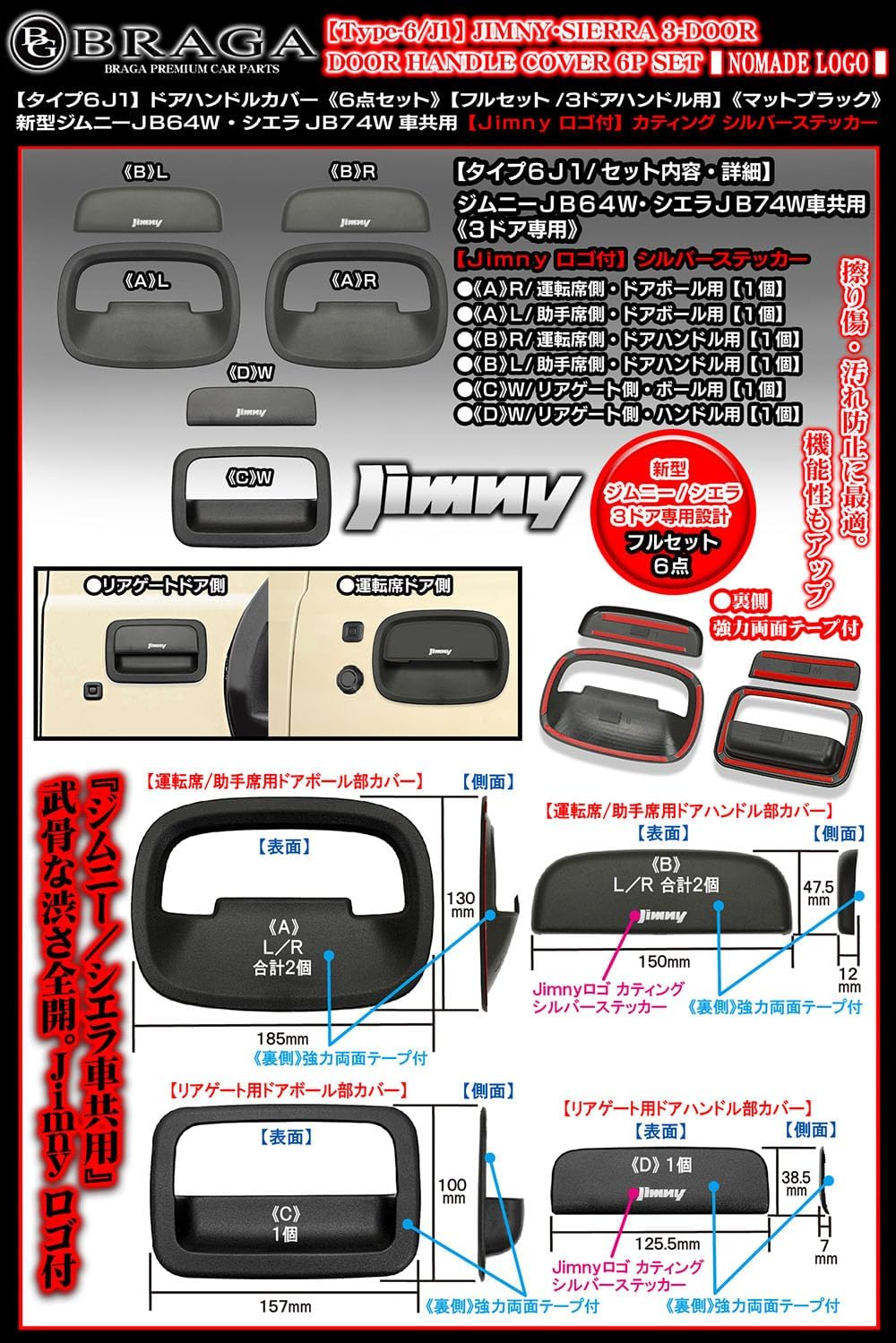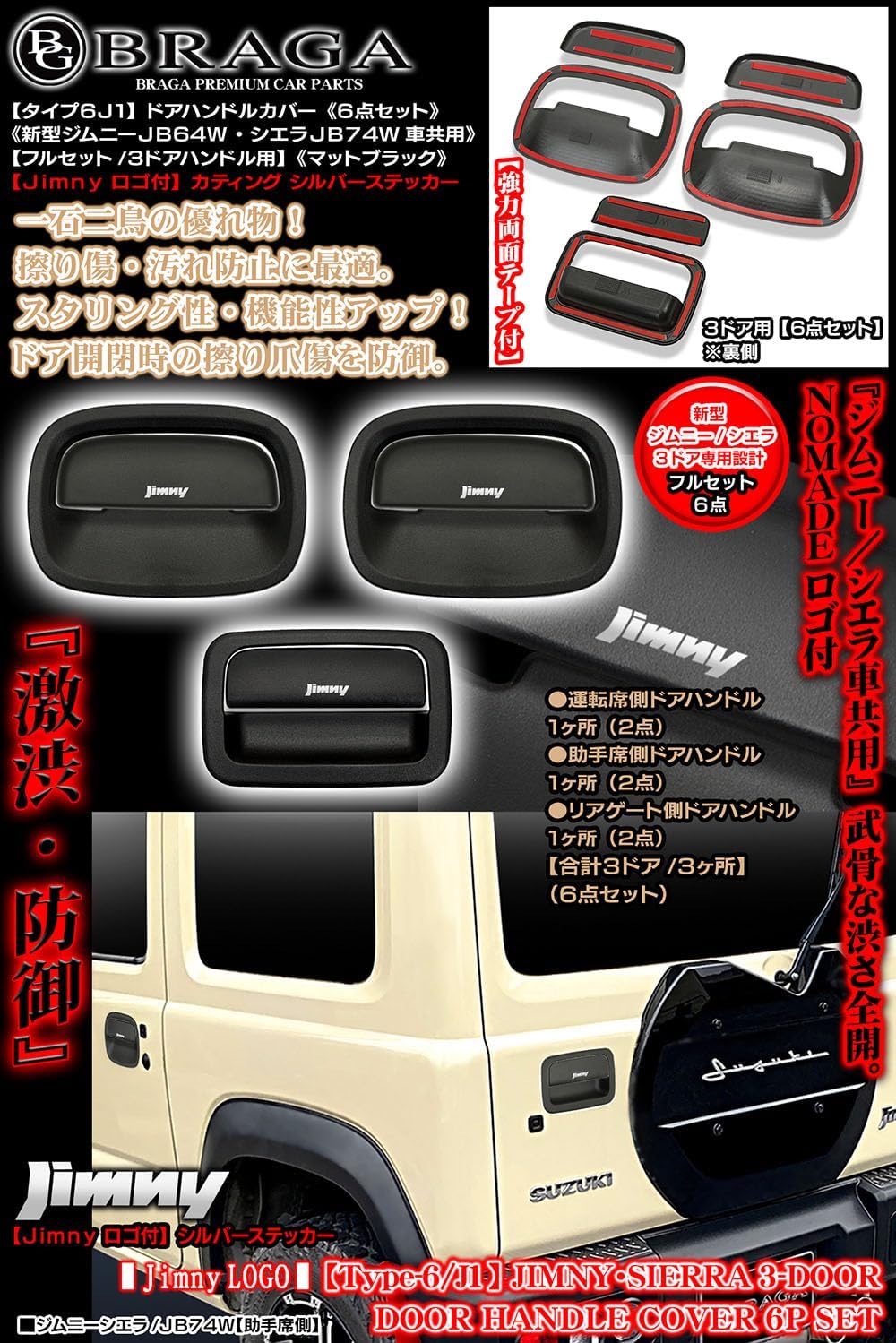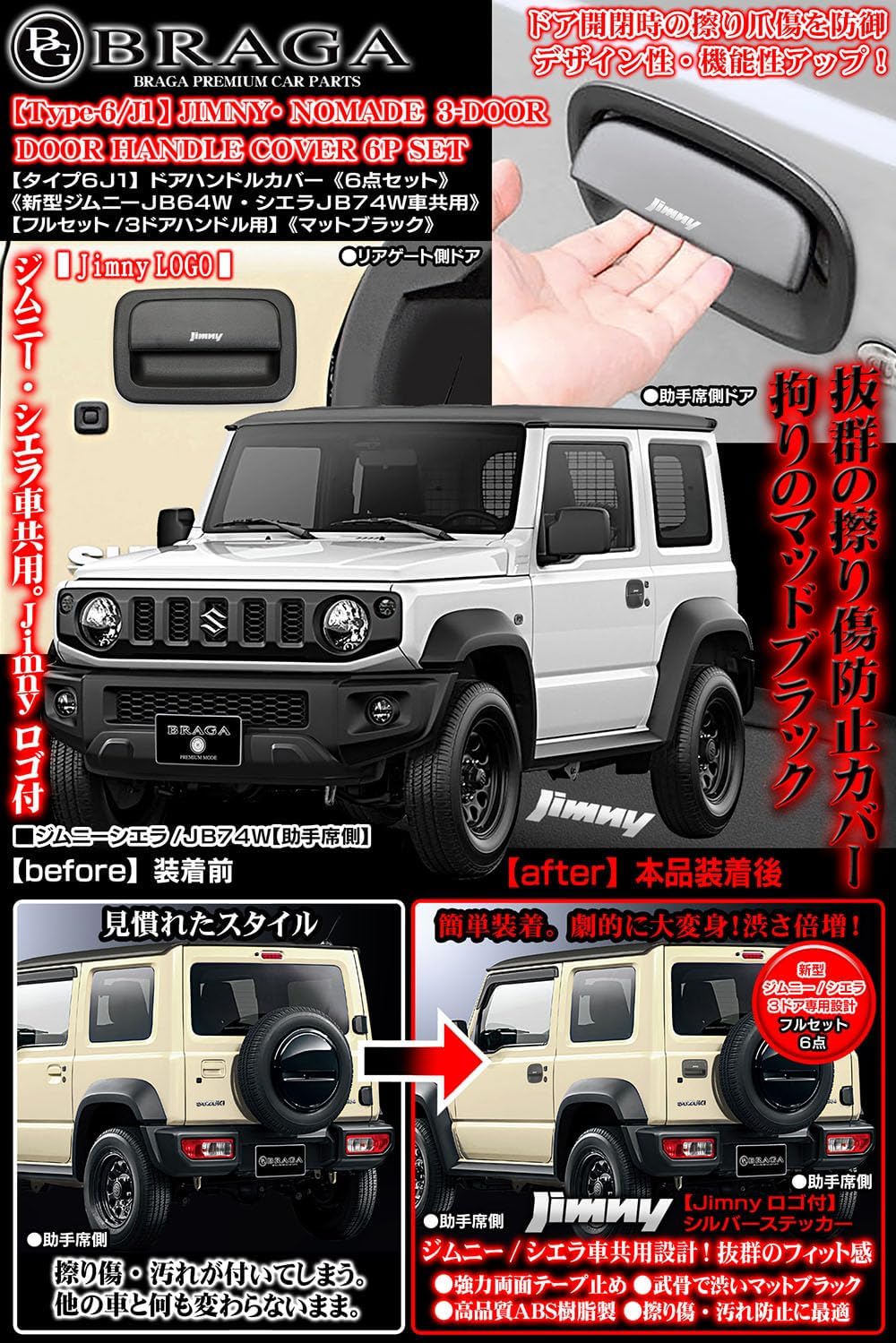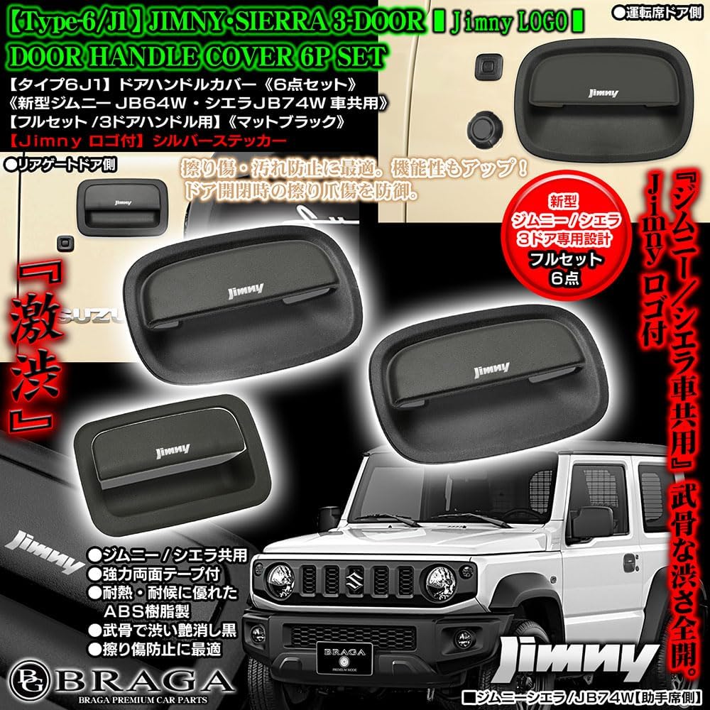 【タイプ6J1/6P】Jimny ロゴ付/ドア ハンドル ノブ カバー/ジムニー JB64W シエラ JB74W車用/6点セット 1台分フルセット/武骨なマットブラック 艶消し黒/取付簡単 強力両面テープ止め/ブラガ BG BRAGA
