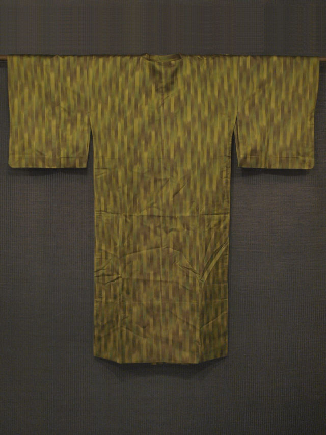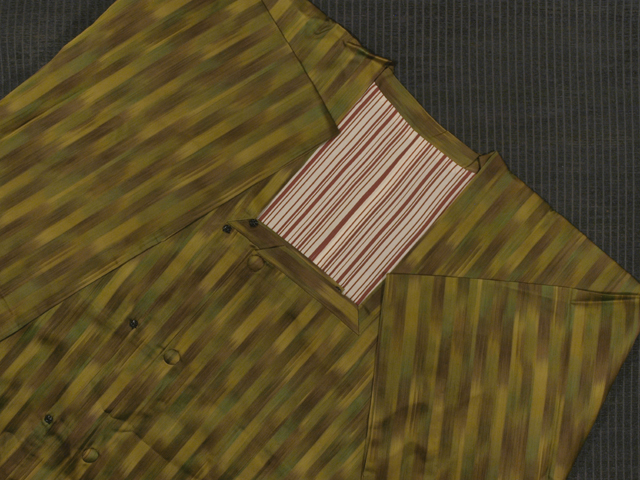 全体的な印象としては黒茶色、苔(こけ)色、黄朽葉(きくちば)色といった感じの地に、かすれ縞の文様が織り込まれている、繻子織の雨コートです。単衣仕立てです。 渋めのアースカラーがシックな雰囲気です。なめらかな手ざわりの綸子地です。 使用感はなく、未使用保管品と思われます。保管上のものと思われるごくこまかな糸引きが若干ありますが、目にはつかず、気にはなりません。そのほかに目につくしみやよごれ、褪色などのダメージはなく、きれいな状態です。 |