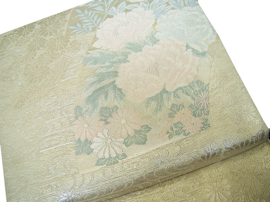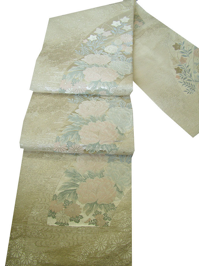 | 商品説明 | しなやかな結び易い西陣織の「紗」の袋帯。 渋い練色地に灰色、銀、水浅葱色、薄ピンク色等の花柄。 六通柄。 |