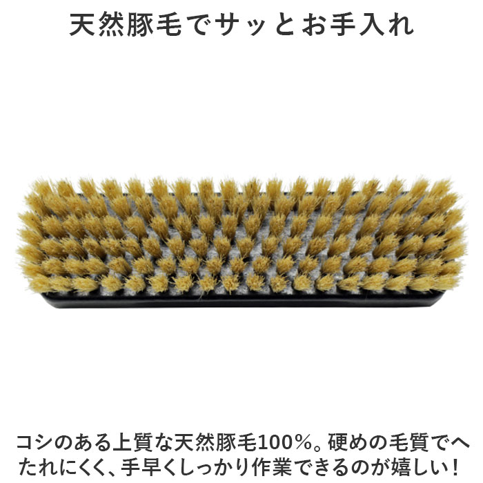 | 商品説明 | ・・大切な靴のお手入れに。靴磨きなどに便利な「DONOK ワイドブリストルブラシ」が新登場。 ・【天然豚毛でサッとお手入れ】 ・コシのある上質な天然豚毛100%。硬めの毛質でへたれにくく、手早くしっかり作業できるのが嬉しい! ・【心地よくフィットする形状】 ・握りやすく磨きやすい大きさと、持ち手の長さがポイント。靴クリームを使用したお手入れにも最適。 ・【使いやすさにこだわった仕様】 ・毛の色が薄めなのでクリームの色がわかりやすく、使い分けもしやすい! ・【なめらかな革のお手入れに】 ・スムースレザーなど、なめらかな革のお手入れにもおすすめ。家庭に1つあると重宝。 ・【靴好きな方へのギフトにも】 ・どなたでも使いやすいスタイリッシュなデザイン。プレゼントにも喜ばれるアイテム。 |