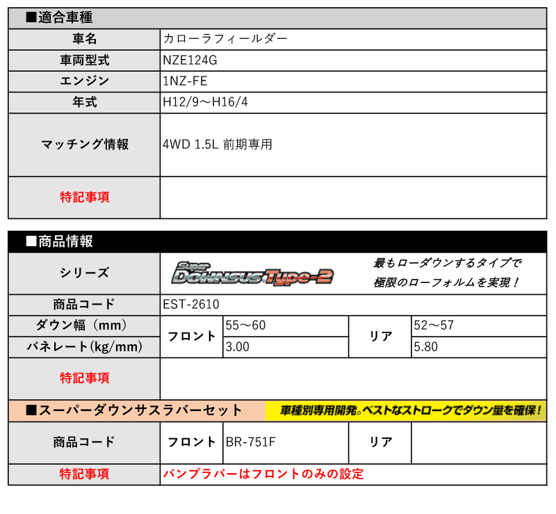 [エスペリア]NZE124G カローラフィールダー(4WD 1.5L 前期_H12/9~H16/4)用スーパーダウンサスType-2&バンプラバー[車検対応] 收藏