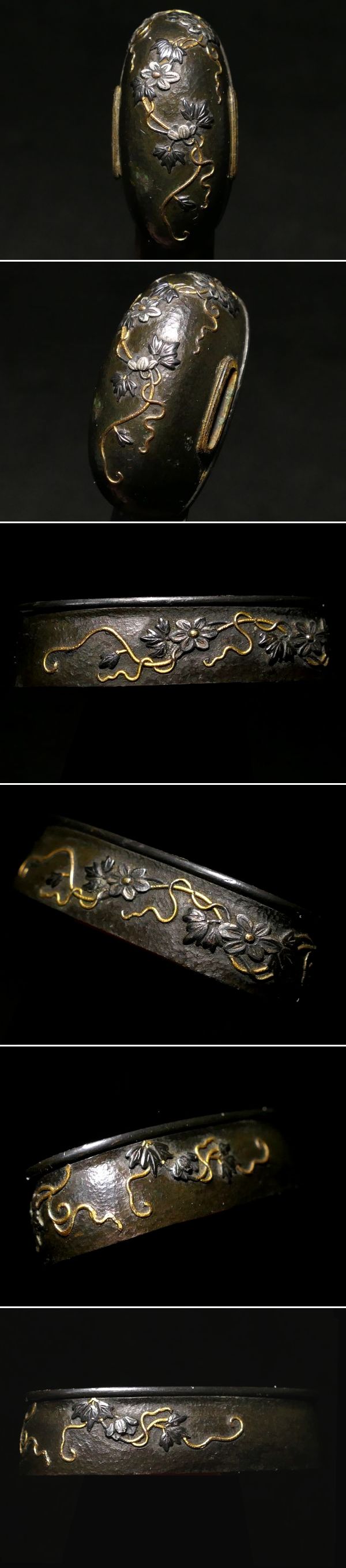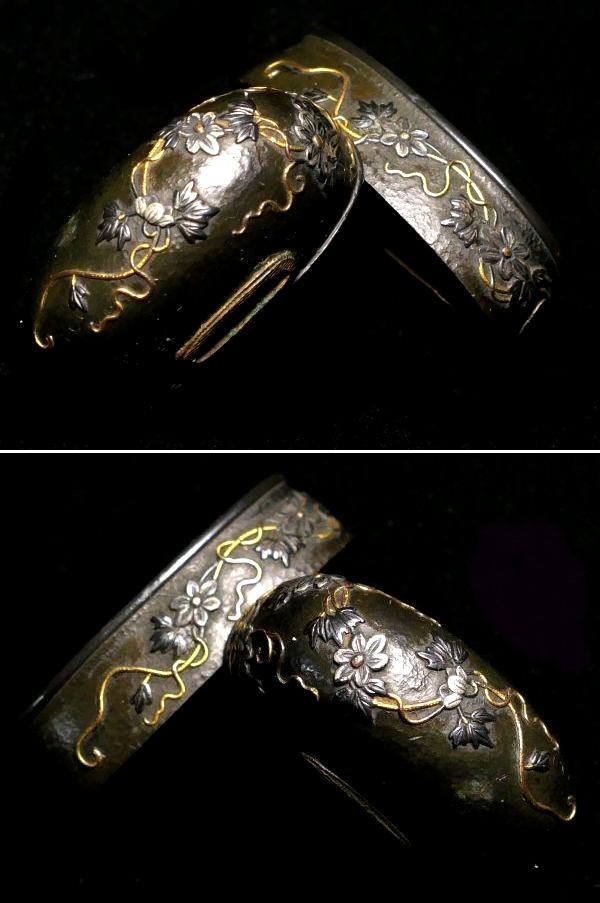 | 商品説明 | 繊細かつ華やかな金銀象眼色絵により 洗練された花唐草細工の施された 飾り栄えする生まれ良き一品です。 作行から見て 肥後の名作と推測しております。 詳しくは画像にてご確認下さい。 拵え用のパーツにいかがでしょうか。 この機会に是非手に入れて下さい。 【鮮やかな金銀象眼】 【上手の花唐草細工】 【見栄え良き一品です】 寸法: (縁) 約 3.90cm × 約 2.12cm × 約 1.00cm (厚み) (頭) 約 3.48cm × 約 1.65cm × 約 1.46cm (厚み) 時代: 江戸時代 材質: おそらく朧銀地と思われますが、四分一地かもしれません。 どちらにしましても良い材質です。画像にてご確認下さい。 桐箱付 銘 : 無銘 状態:特に気になる傷みはなく良好。画像にてご判断下さい。 :許容範囲内の時代傷みはご理解下さい。 |