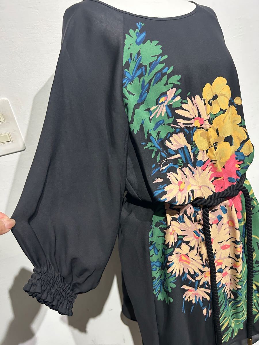 黒地にカラフルな花柄のロングワンピース、ウエストリボン付きでバルーンスリーブデザイン。| 出价者 | 信用 | 价格 | 时间 |