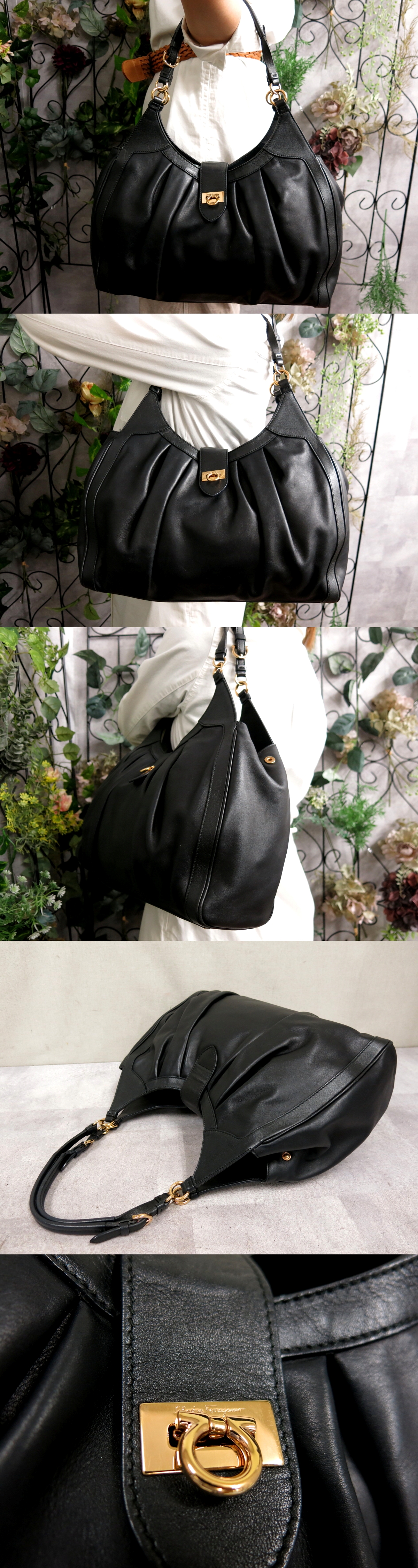 ●超美品●Salvatore Ferragamo フェラガモ●ガンチーニ●カーフ レザー 本革●ハンド ショルダー バッグ●黒●G金具●肩掛け●B5●Js56298 收藏