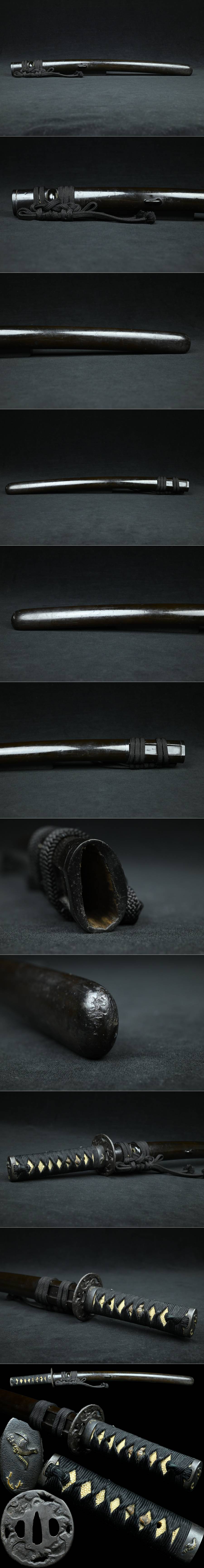 【昊】時代 葉図鍔 鳥図目貫縁頭 黒漆塗鞘 外装拵え 刀装具[SD12Us] 收藏