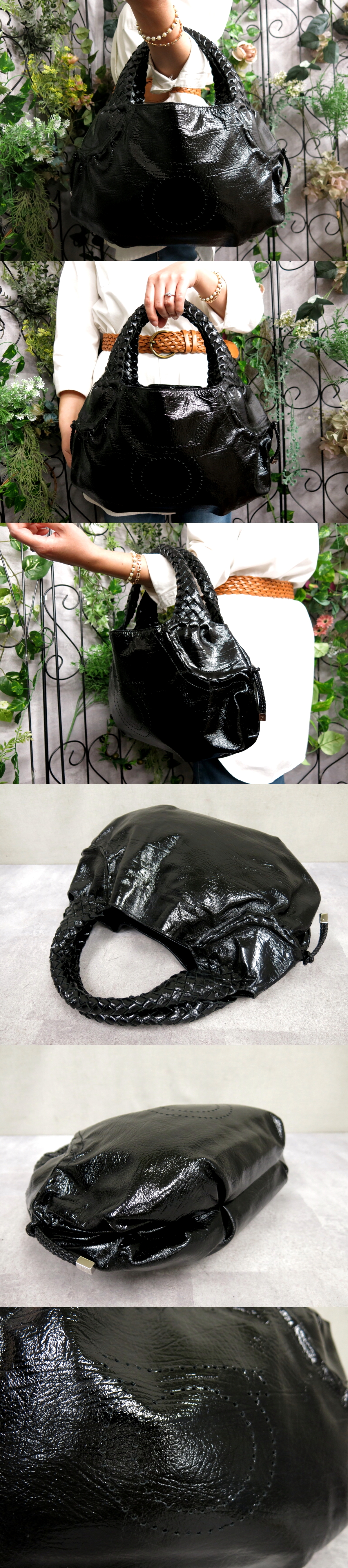 ●超美品●Salvatore Ferragamo フェラガモ●ガンチーニ●パンチング●エナメル パテント レザー 本革●ハンド バッグ●黒●B5●Js56498 收藏