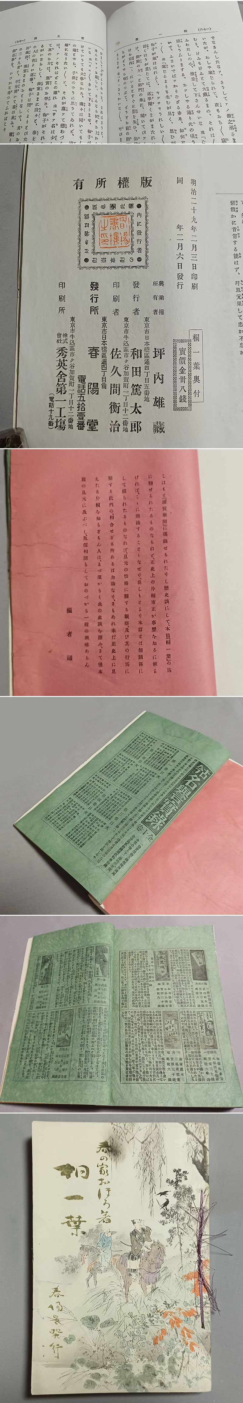 | ★坪内逍遥 代表作、鈴木華邨 木版刷り表紙・見開き口絵★『桐一葉』、明治29年、初版、春陽堂★近代演劇のパイオニア、生田敦夫(洗竹亭)旧蔵、保存用拵え帙入り | ||||||||||||||||||