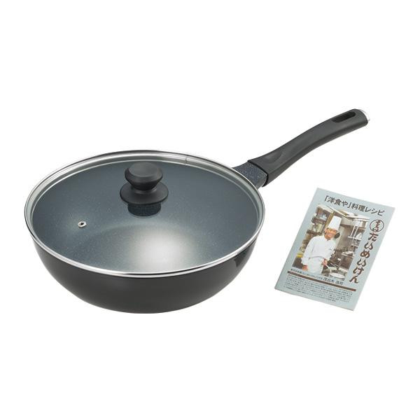 | 側面は薄く、口元と底面は厚く変形しにくい造りになっています。内面はフッ素加工を施し、お手入れがしやすい。「たいめいけん」ミニレシピ付き。 |